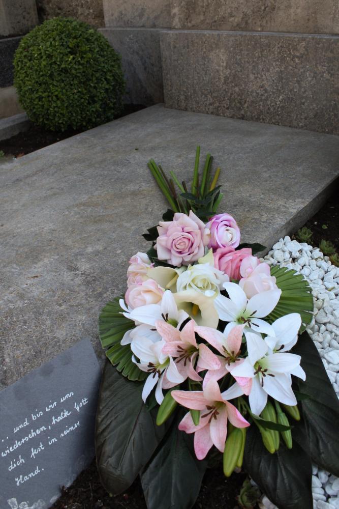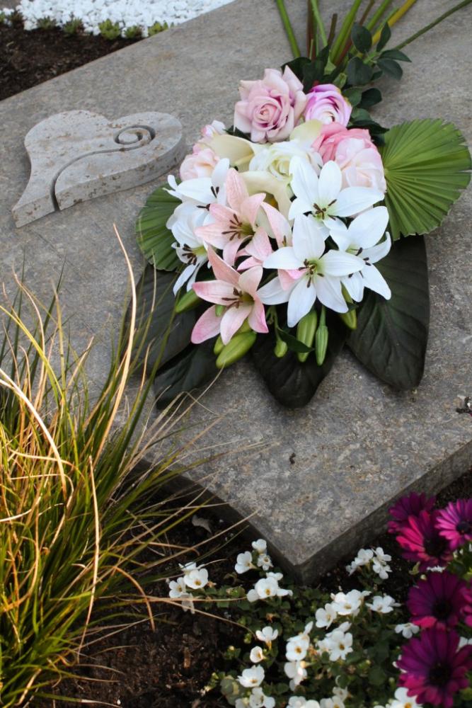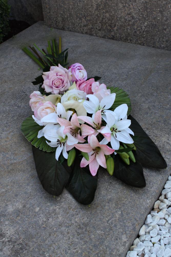 ¡Flores en honor a los difuntos! Esta imagen de tumba es un poco más elaborada, pero aún más impresionante. Los lirios blancos simbolizan la pureza y se asocian con la nueva vida y el renacimiento. Por eso son un elemento decorativo muy popular en los servicios funerarios, pero también suelen ser un regalo en las bodas. Las rosas en varios tonos de rosa, blanco y rosa pastel, así como las calas blancas, completan la decoración floral de este arreglo. Por supuesto, no puede faltar algo de vegetación. Se han seleccionado dos tipos de hojas decorativas para formar una base para el arreglo floral de la parte superior. ¡Compra el look!