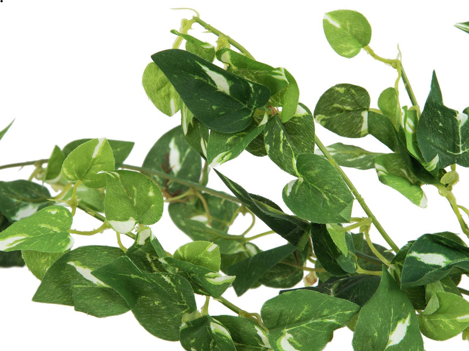 - Con zarcillos, hojas de plástico en color verde oscuro y tonos blancos para un aspecto natural