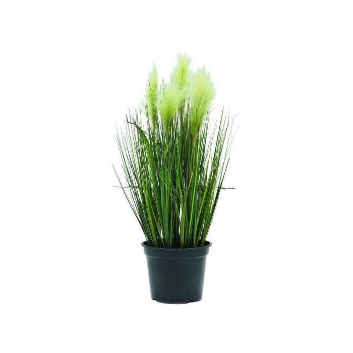 Plumero con tallos de color verde oscuro y panojas blancas en un tiesto decorativo. La planta artificial es de unos 60 cm de altura total.