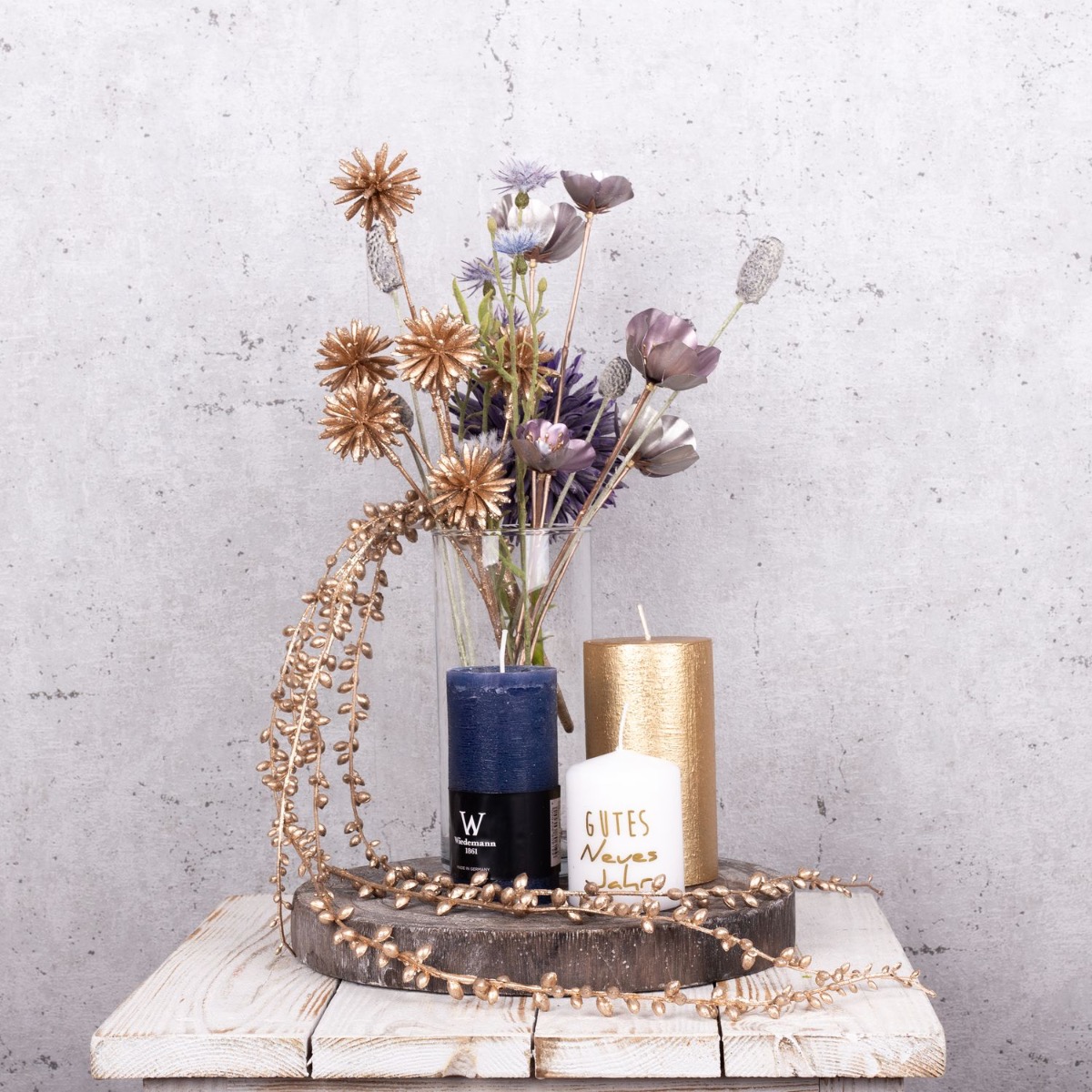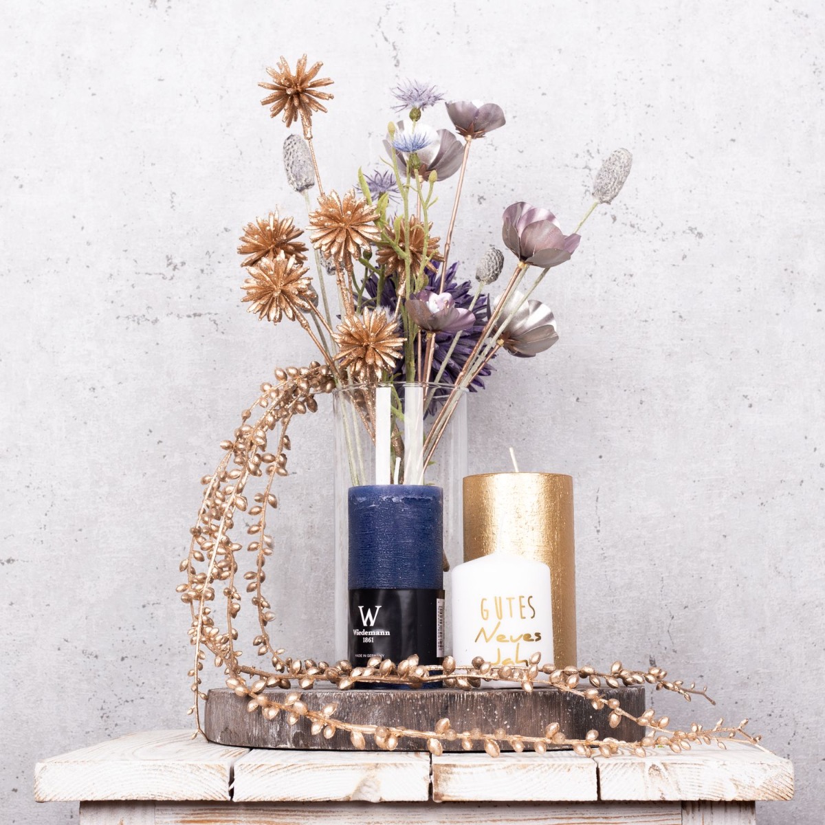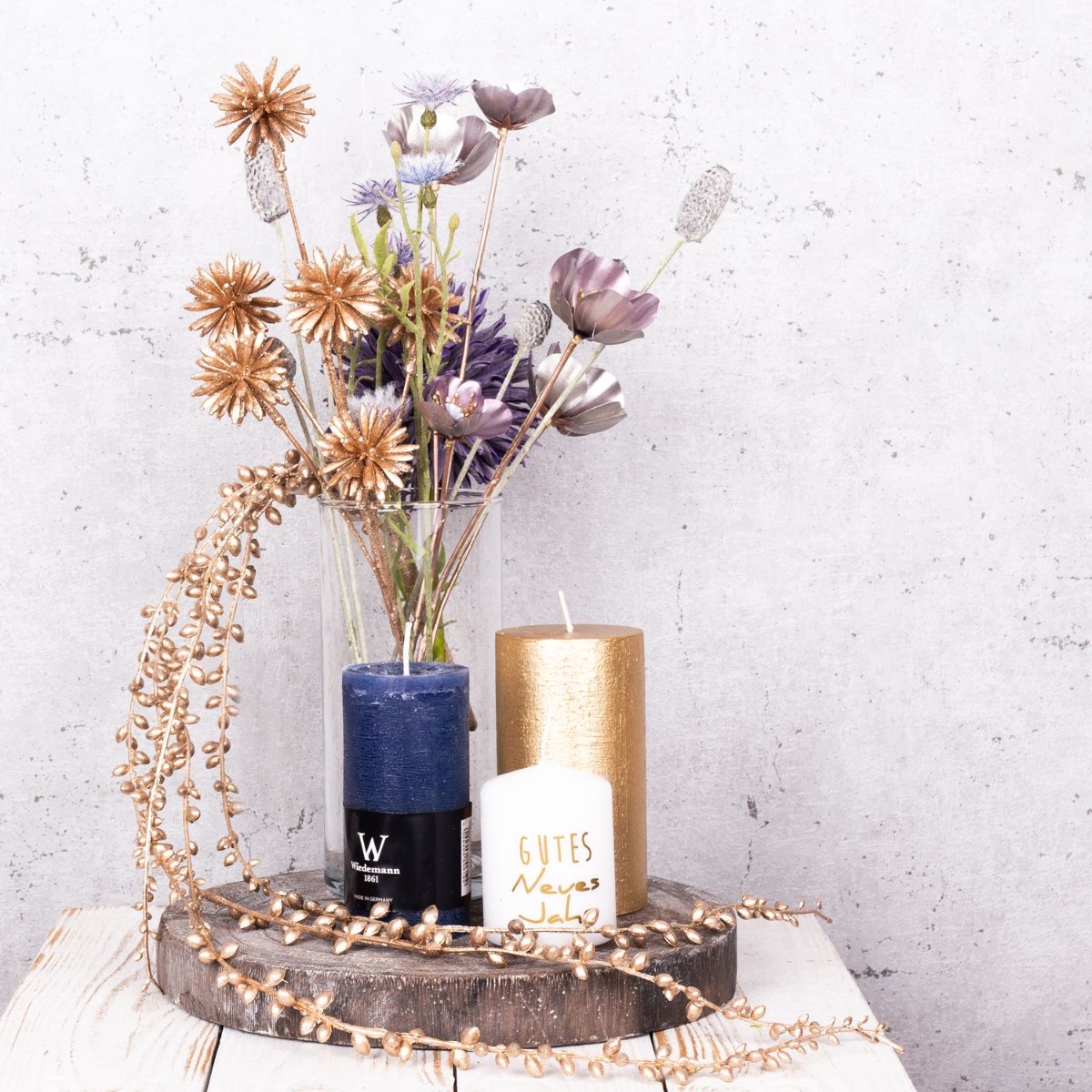 Consejo de diseño: Corta las flores al tamaño del jarrón y colócalas en él. El colgante de senecio dorado debe serpentear hacia abajo y jugar alrededor de las velas. Coloca las velas de forma que la llama no esté demasiado cerca de las flores artificiales.