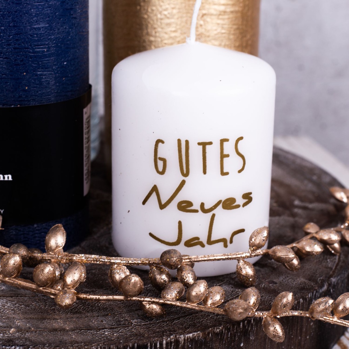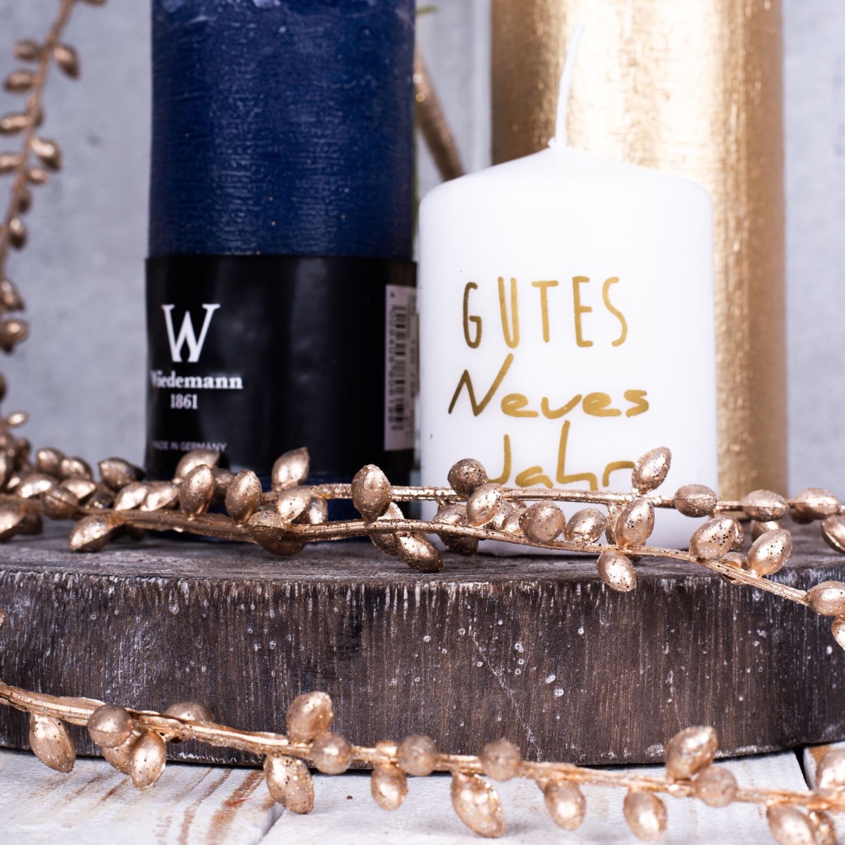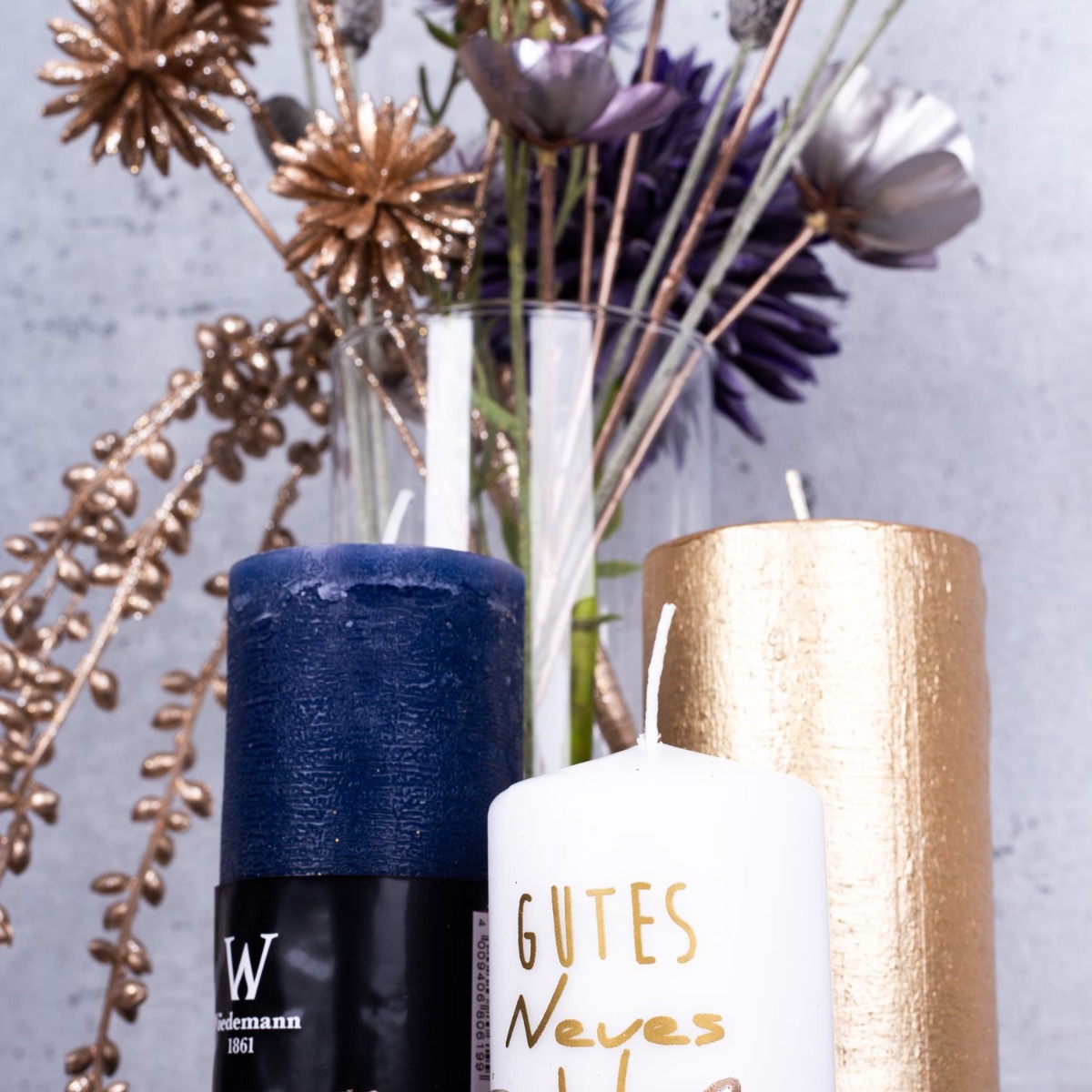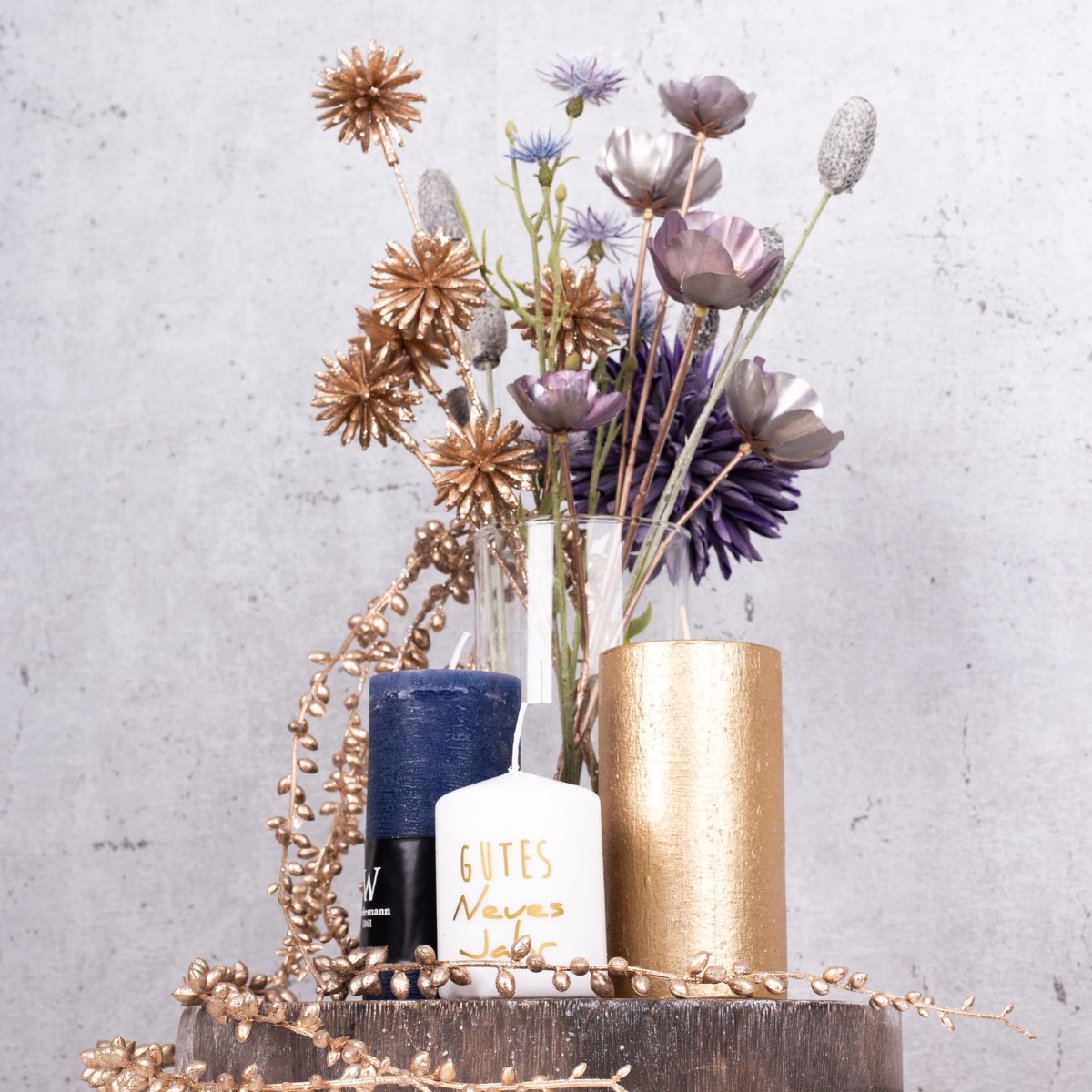 Consejo de diseño: Corta las flores al tamaño del jarrón y colócalas en él. El colgante de senecio dorado debe serpentear hacia abajo y jugar alrededor de las velas. Coloca las velas de forma que la llama no esté demasiado cerca de las flores artificiales.