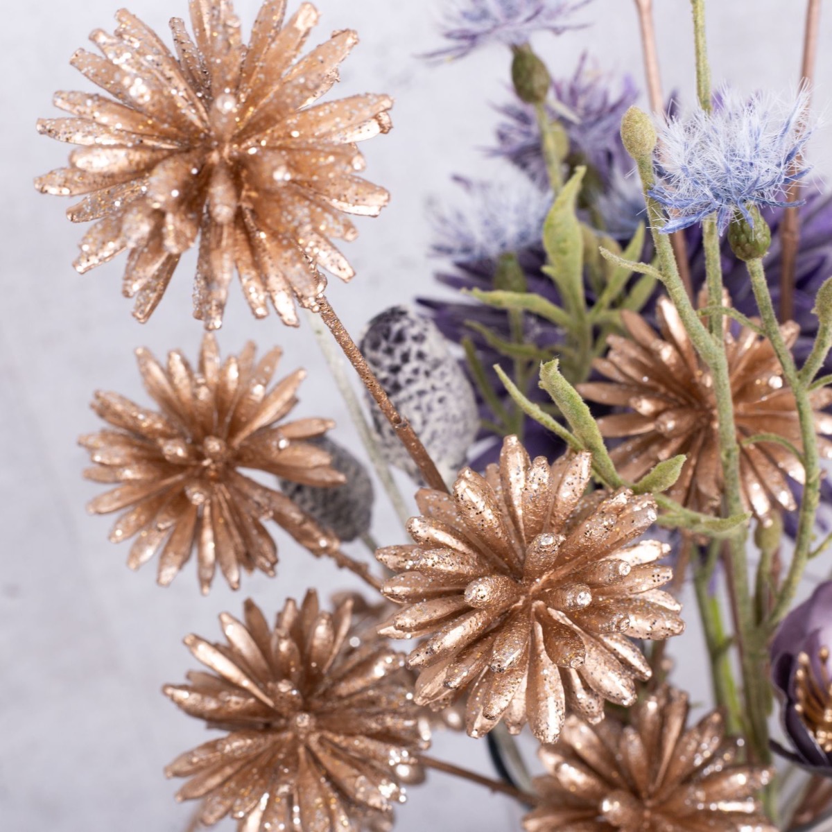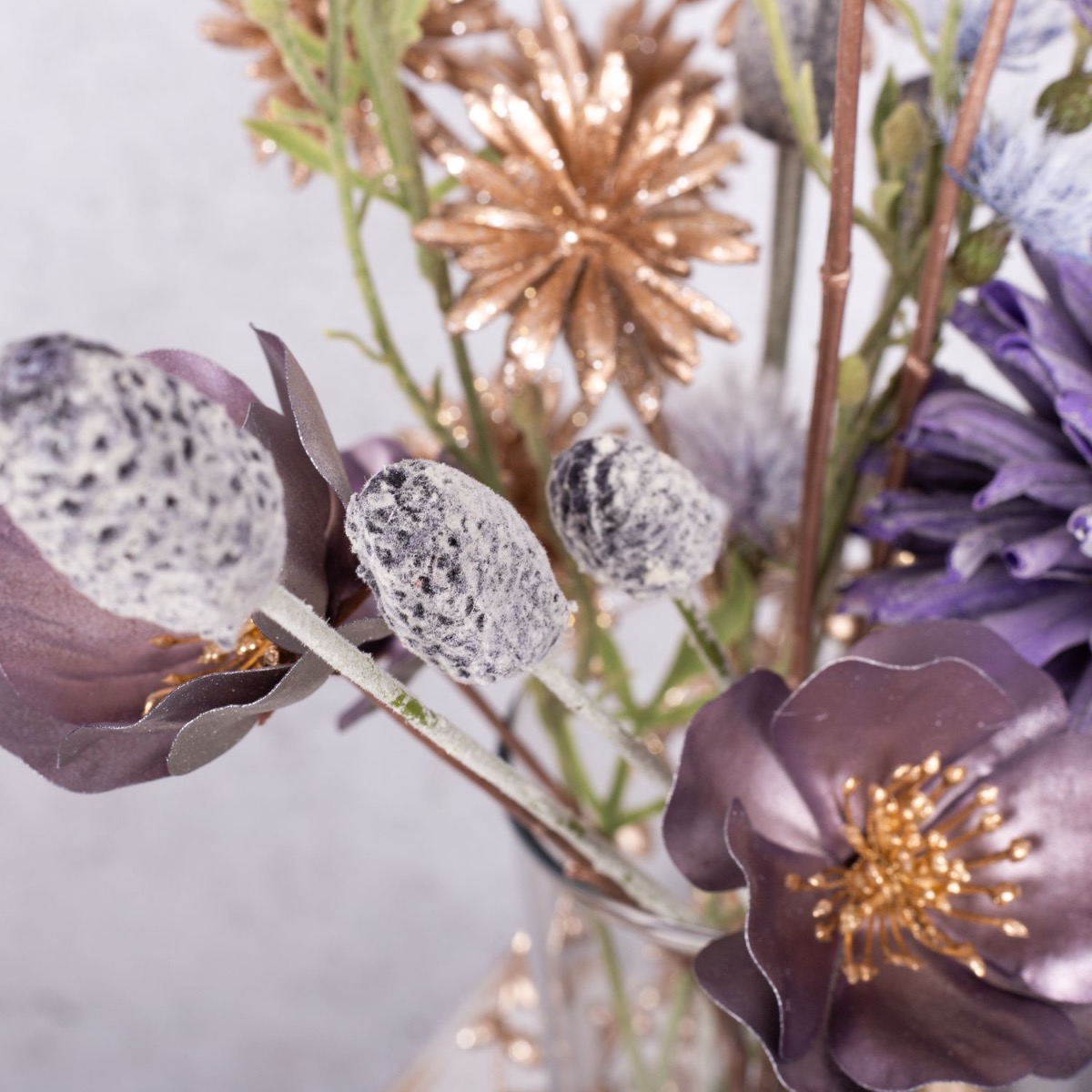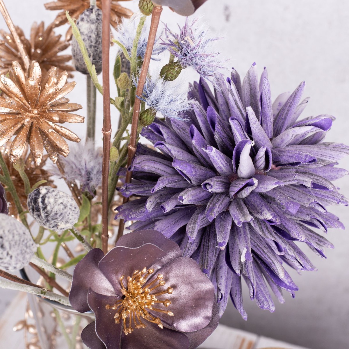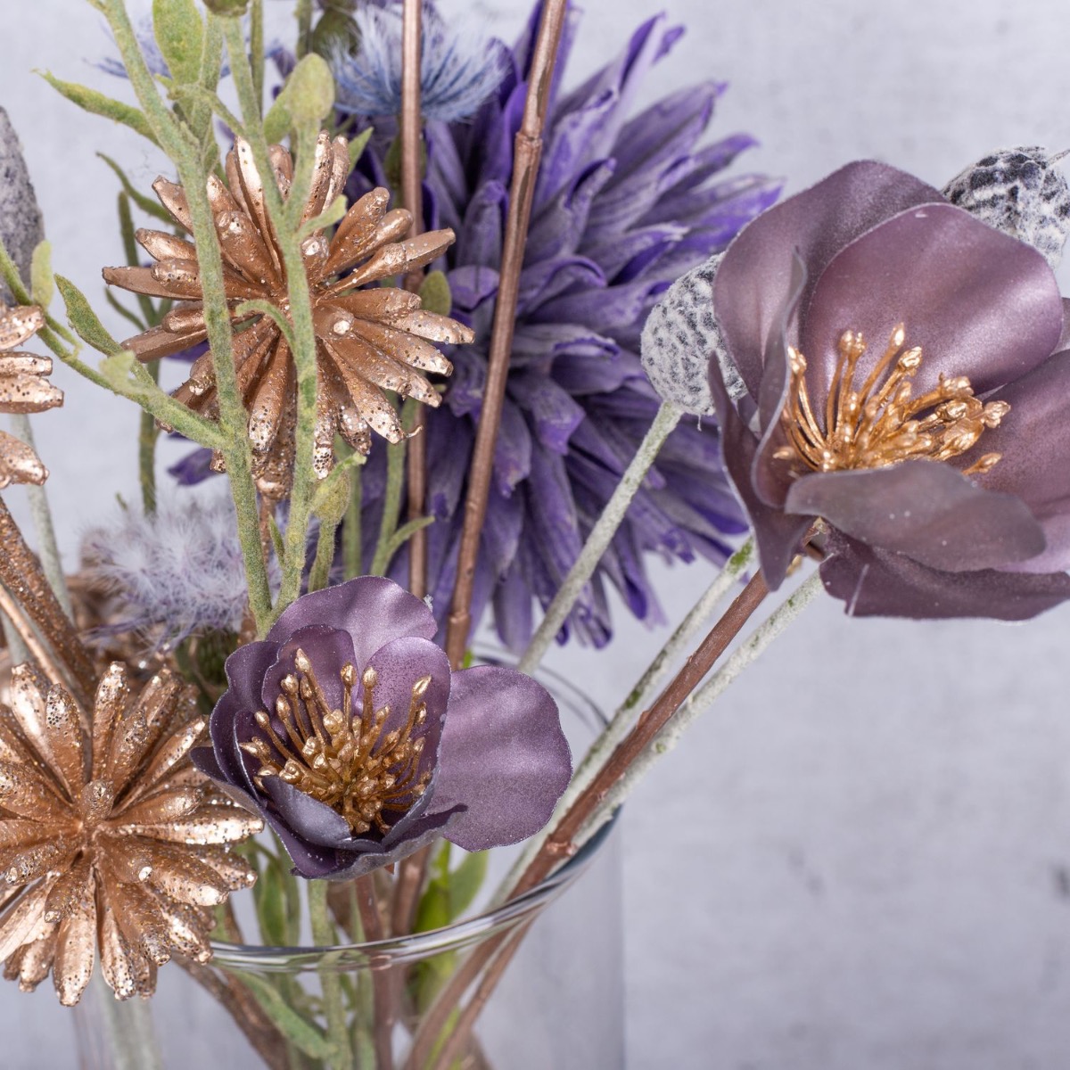 ¡Fuegos artificiales de oro y púrpura! Un pequeño ramo de flores plateadas y doradas que tenga la altura justa para que puedas hablar con la persona que tienes enfrente es la decoración de mesa perfecta para una fiesta de Nochevieja. Varias velas a juego con el color del ramo forman parte de toda buena fiesta de Nochevieja. Los acianos dorados y las rosas de Navidad púrpura plateadas brillan maravillosamente a la luz de las velas. Te pondrán de buen humor. Compra el look!