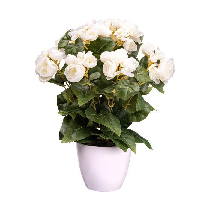 Flor artificial Begonia SYLINA, maceta decorativa blanca, color crema, 35 cm
