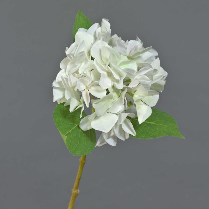 La hortensia artificial AMARILDO en color blanco está unida a un tallo y tiene una longitud de aproximadamente 45 cm.