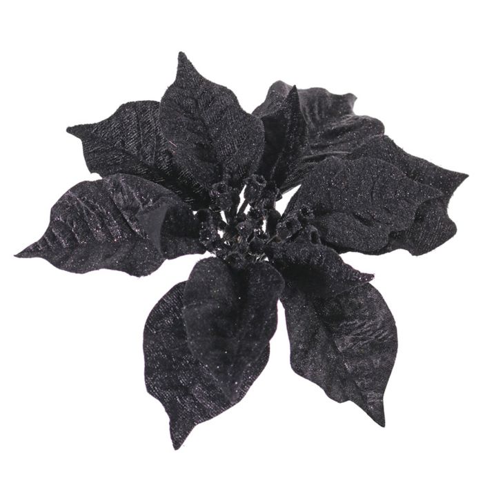 La flor de pascua falsa SPICA es especialmente llamativa por su superficie negra aterciopelada. El clip se puede utilizar para sujetarlo a un árbol de Navidad, una barandilla o una estantería.