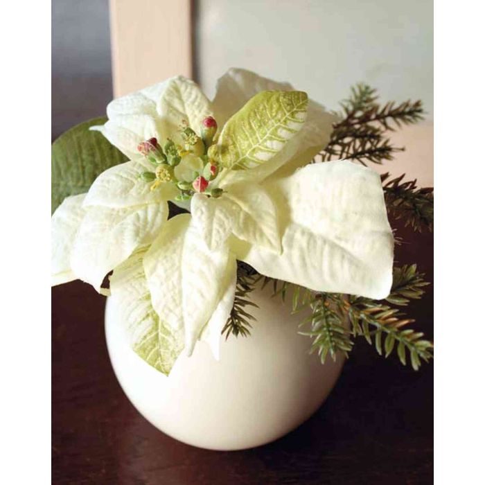 - Con flor de pascua en color crema-verde así como con ramas de abeto y hojas.