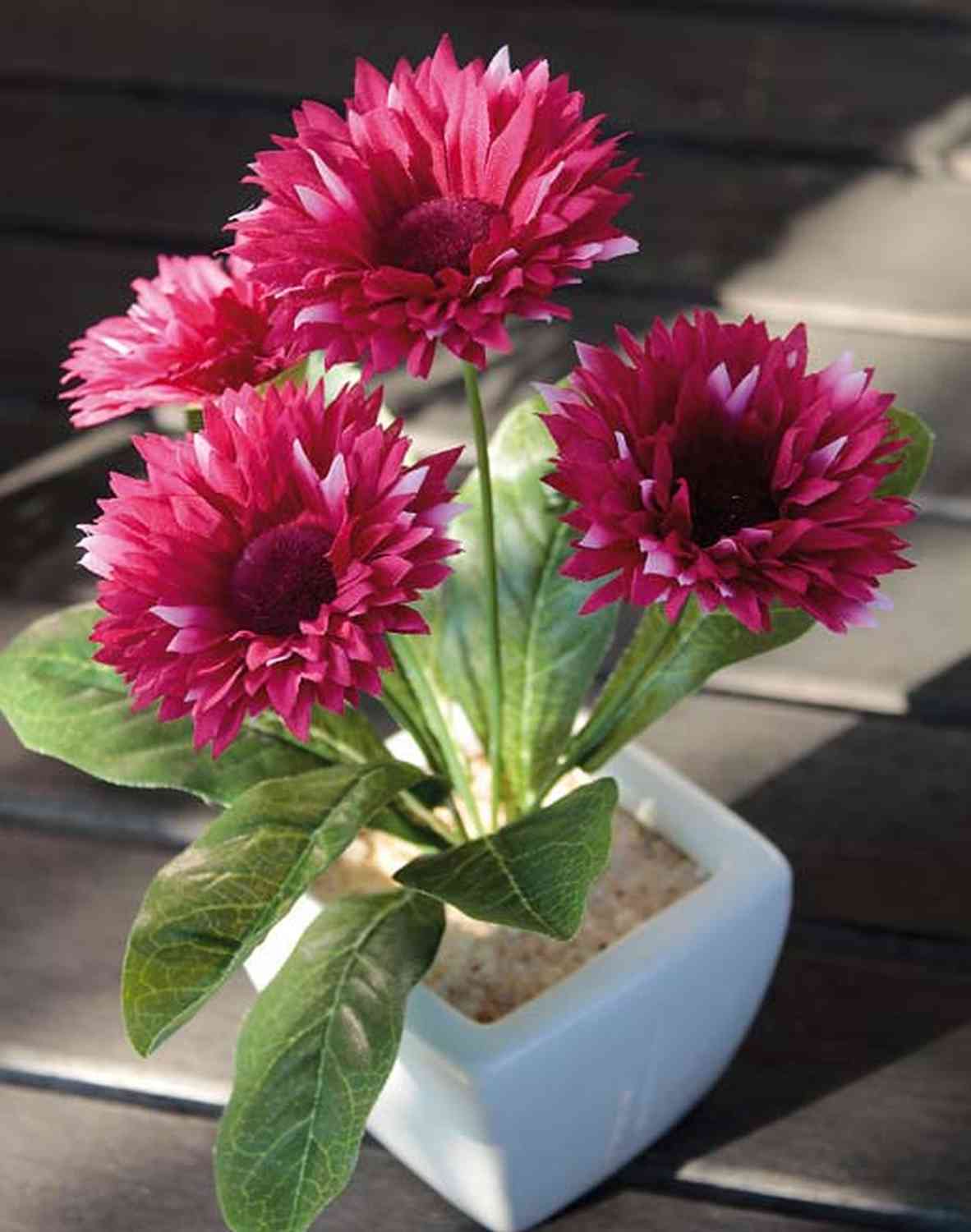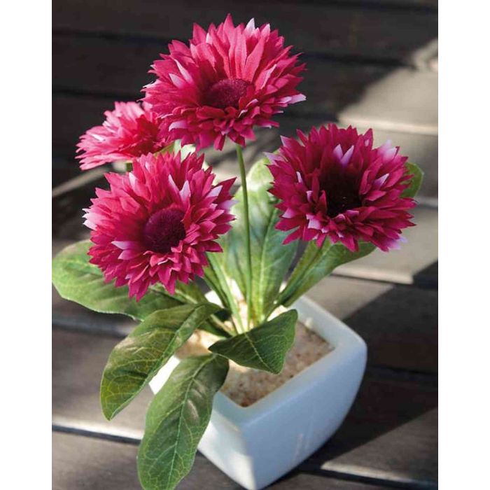 La gerbera de plástico CELINA en color fucsia tiene una altura total de 20 cm. La planta artificial crea un ambiente agradable en la habitación y se suministra en una maceta de cerámica.