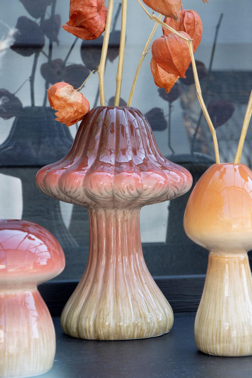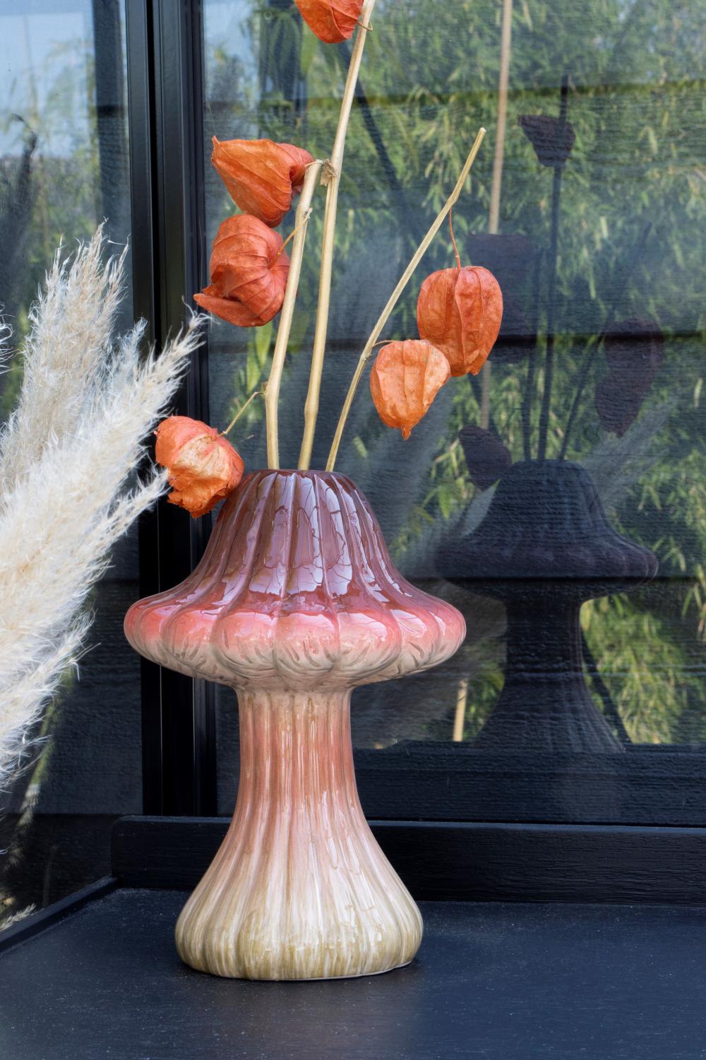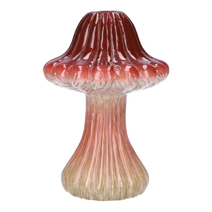 Florero RICHLINDE, falsa oronja, cerámica, ranuras, rojo oscuro-beige, 21cm, Ø15cm