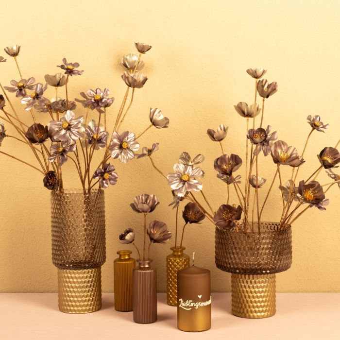 Oro y rosa! Aquí se ha creado un look sofisticado y extravagante con puro glamour. Brillantes jarrones dorados y resplandecientes flores metálicas crean una imagen encantadora. Parece el regalo perfecto para tu persona favorita. El mensaje ya está escrito en la vela. Compra el look!
