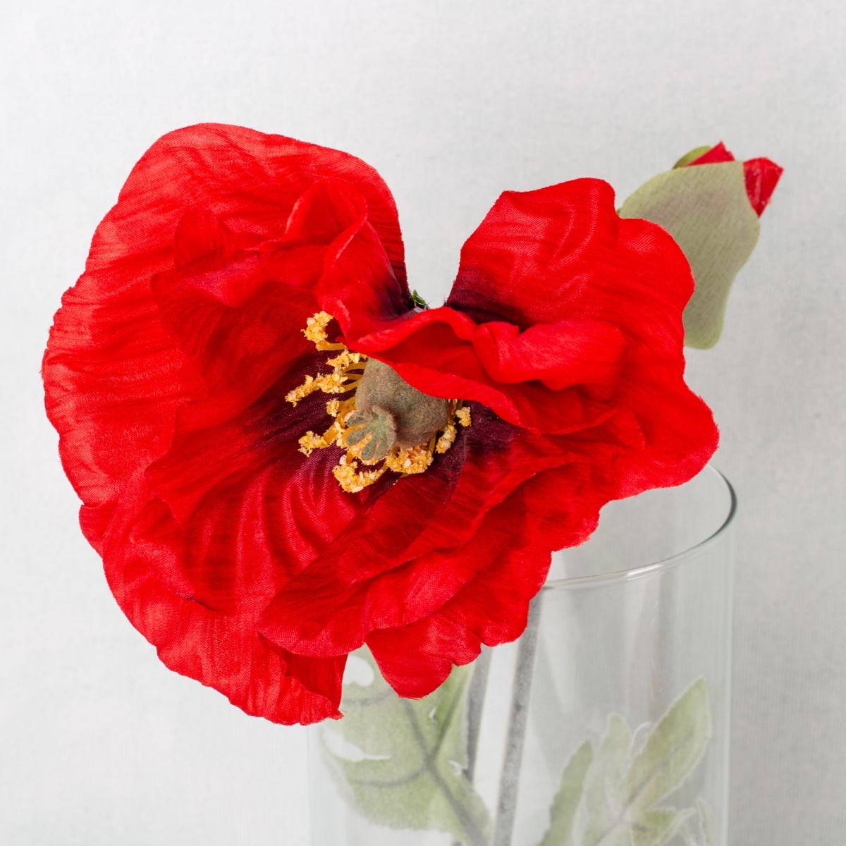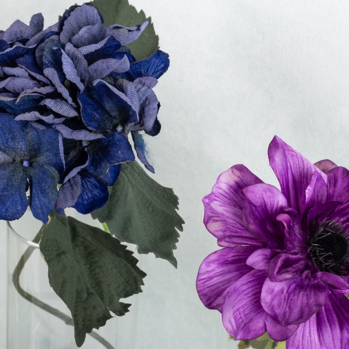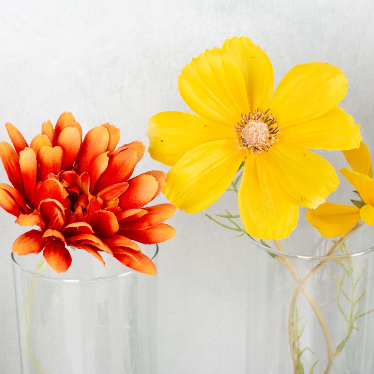 Consejo de diseño: coloca los jarrones a la misma distancia y los vasos pequeños ligeramente desplazados delante. No cortes los tallos de las flores, dóblalos en espiral para que encajen bien en los jarrones. Rellena el vaso pequeño con musgo del mismo color que la flor que hay detrás.