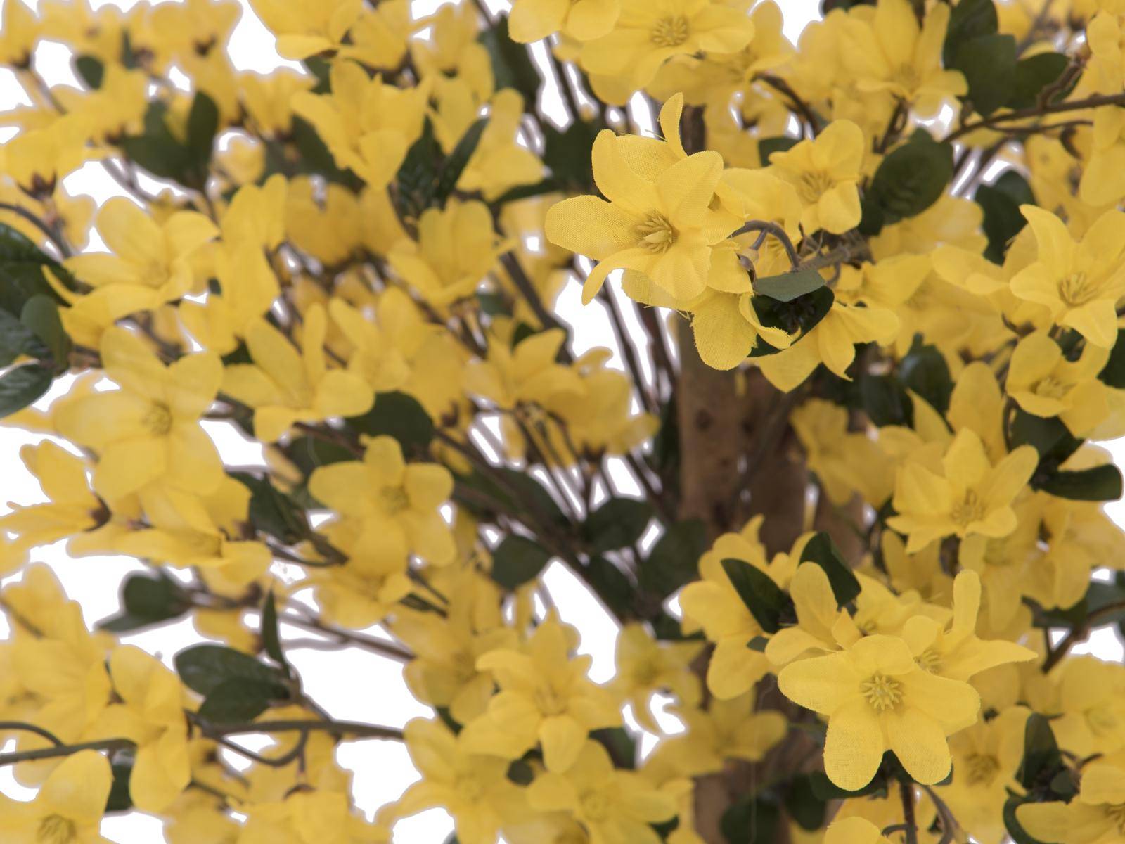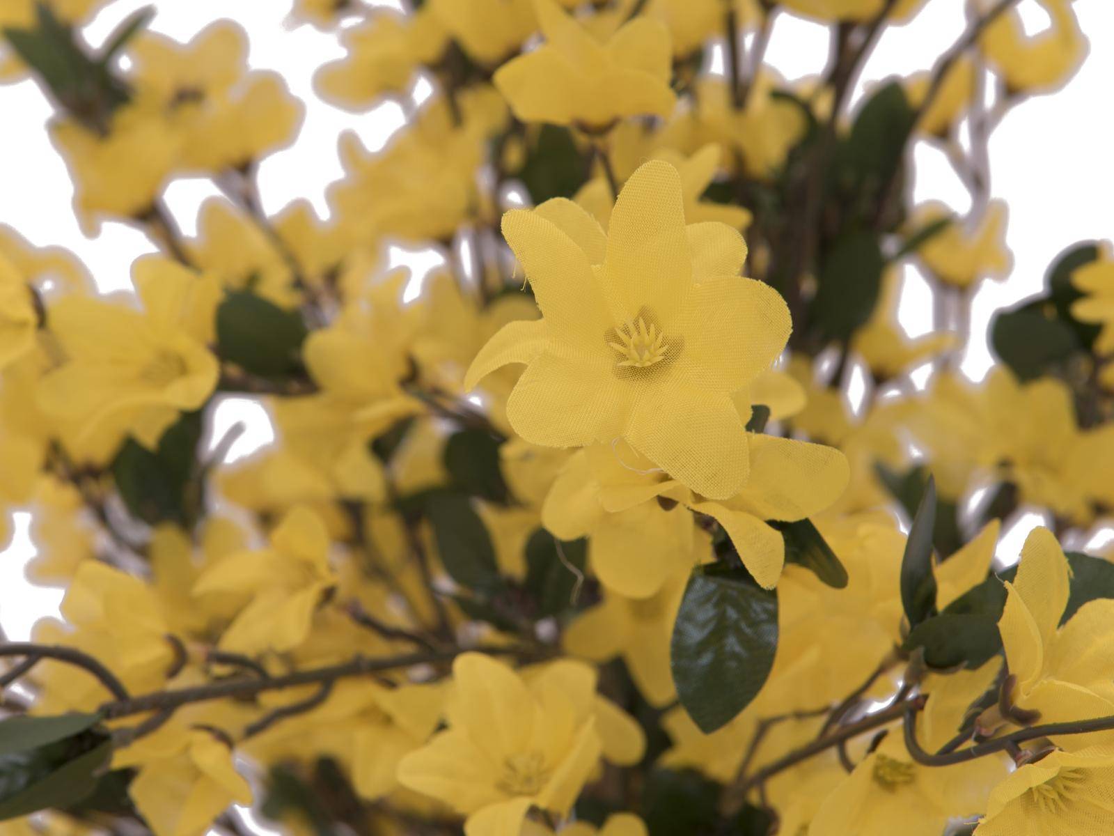 Bonita forsitia MISAKI es ideal para decorar sus habitaciones gracias a sus tropicales flores amarillas. El árbol artificial posee un aspecto real gracias a sus troncos entrelazados con las vides. La forsitia posee una altura total de aproximadamente 150 cm.