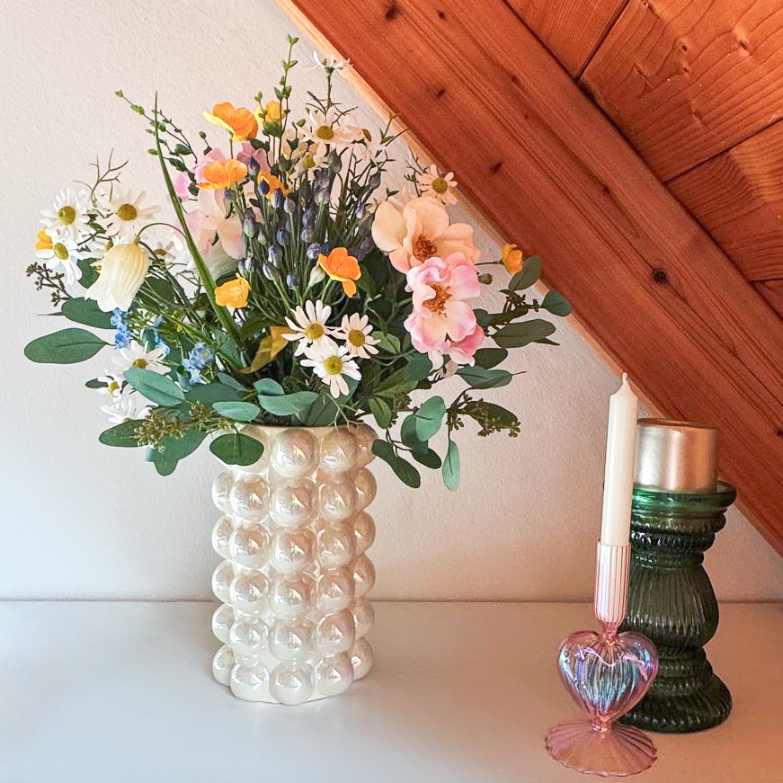 Ejemplo de uso: este ramo queda ideal en aparadores, escritorios o mesas de comedor, sin resultar dominante. En un bonito jarrón de cerámica, se integra fácilmente en estilos de decoración escandinavos, modernos o incluso rústicos. Ya sea en el salón como un toque de color tranquilo, en el pasillo como una bienvenida acogedora o en la oficina en casa como un discreto punto de atracción, crea un ambiente agradable que perdura.