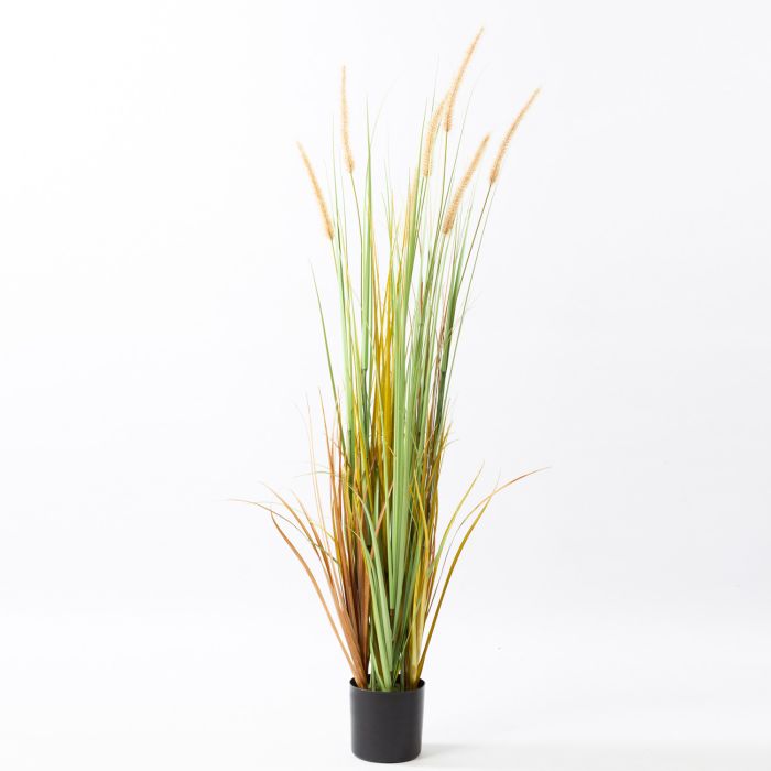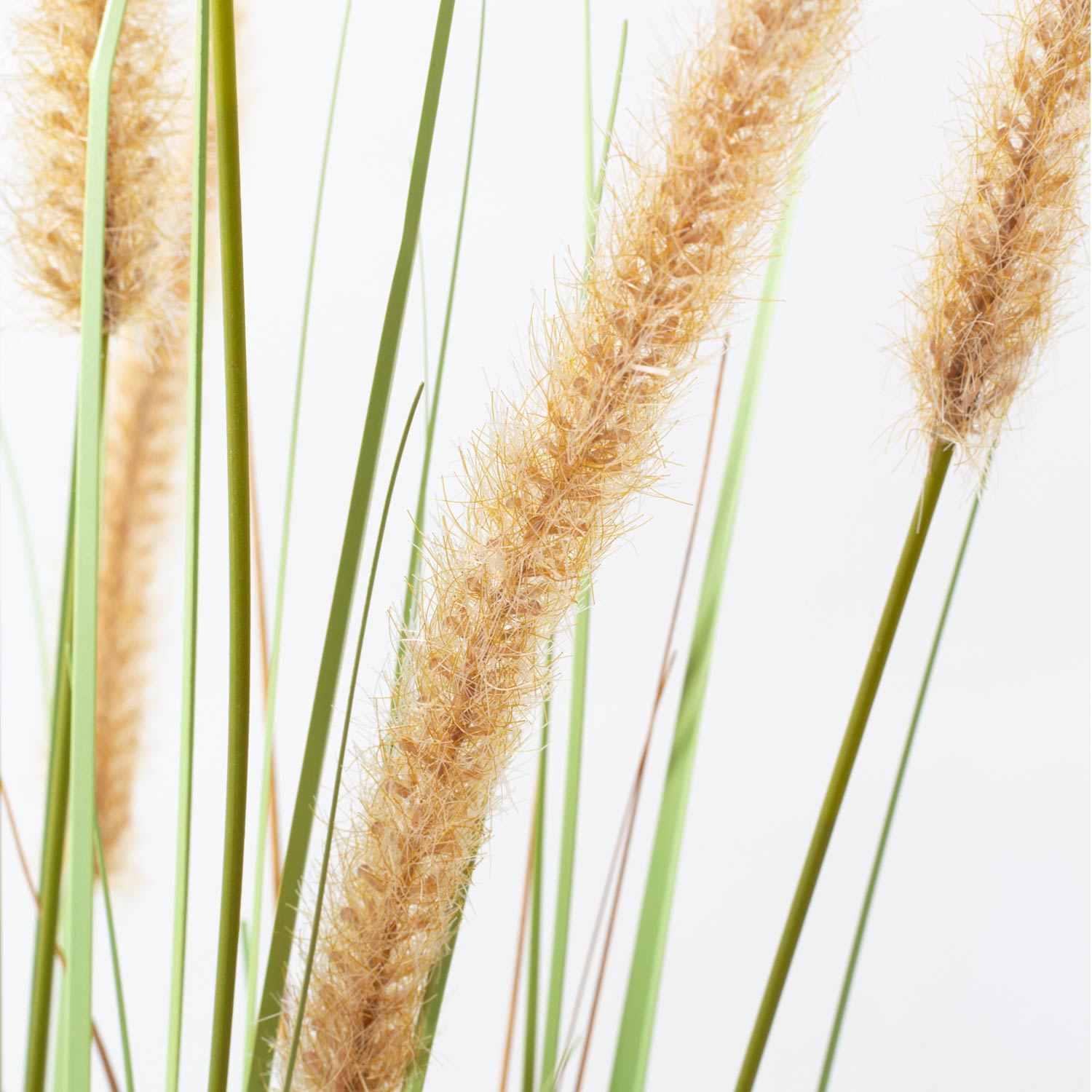 Fuente hierba (Pennisetum alopecuroides) artificial con una altura total de unos 120 cm en tiesto decorativo con piedras.