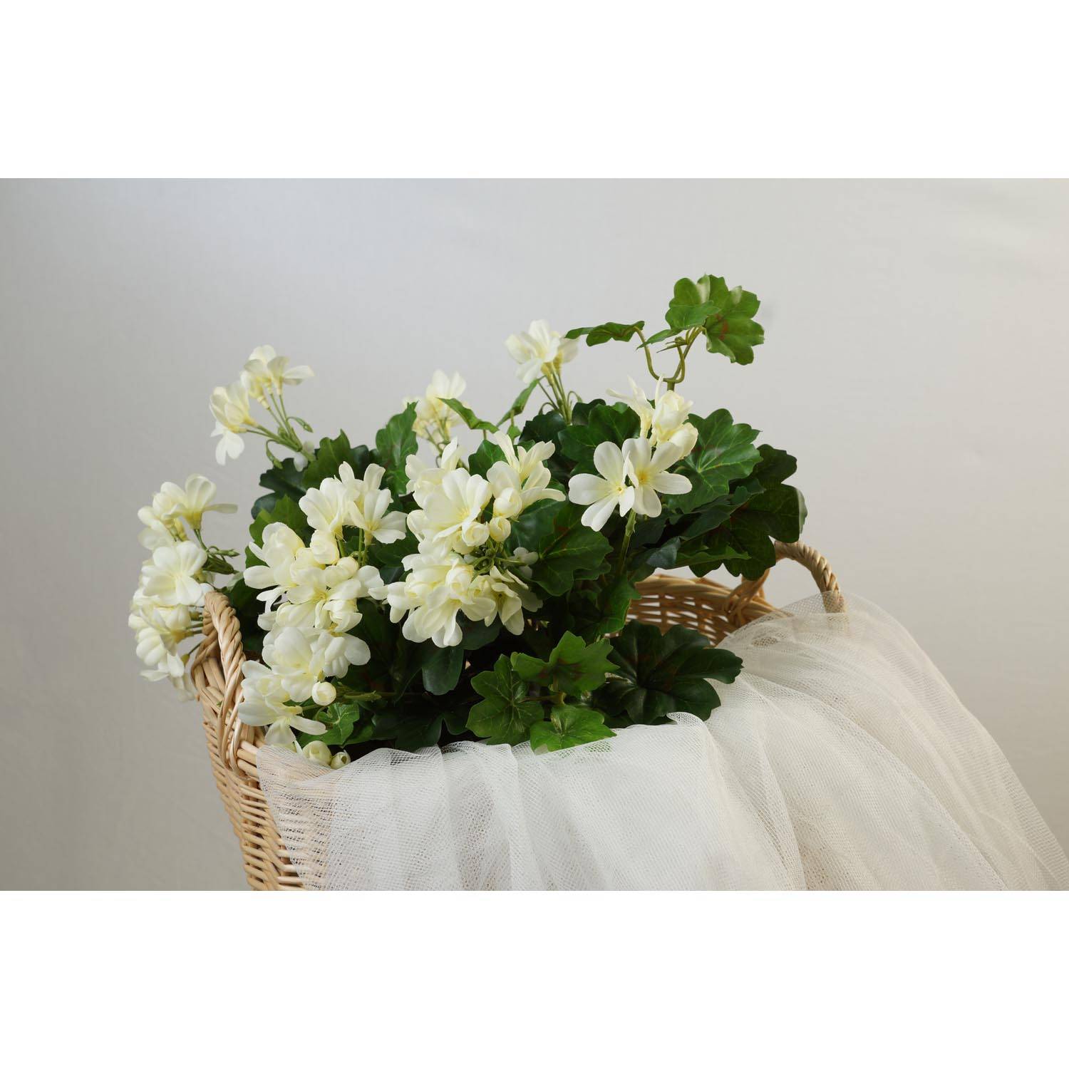Pelargonium artificial para el balcón o la terraza. El Geranium MIA es de unos 40 cm de altura total y tiene flores y capullos blancos.