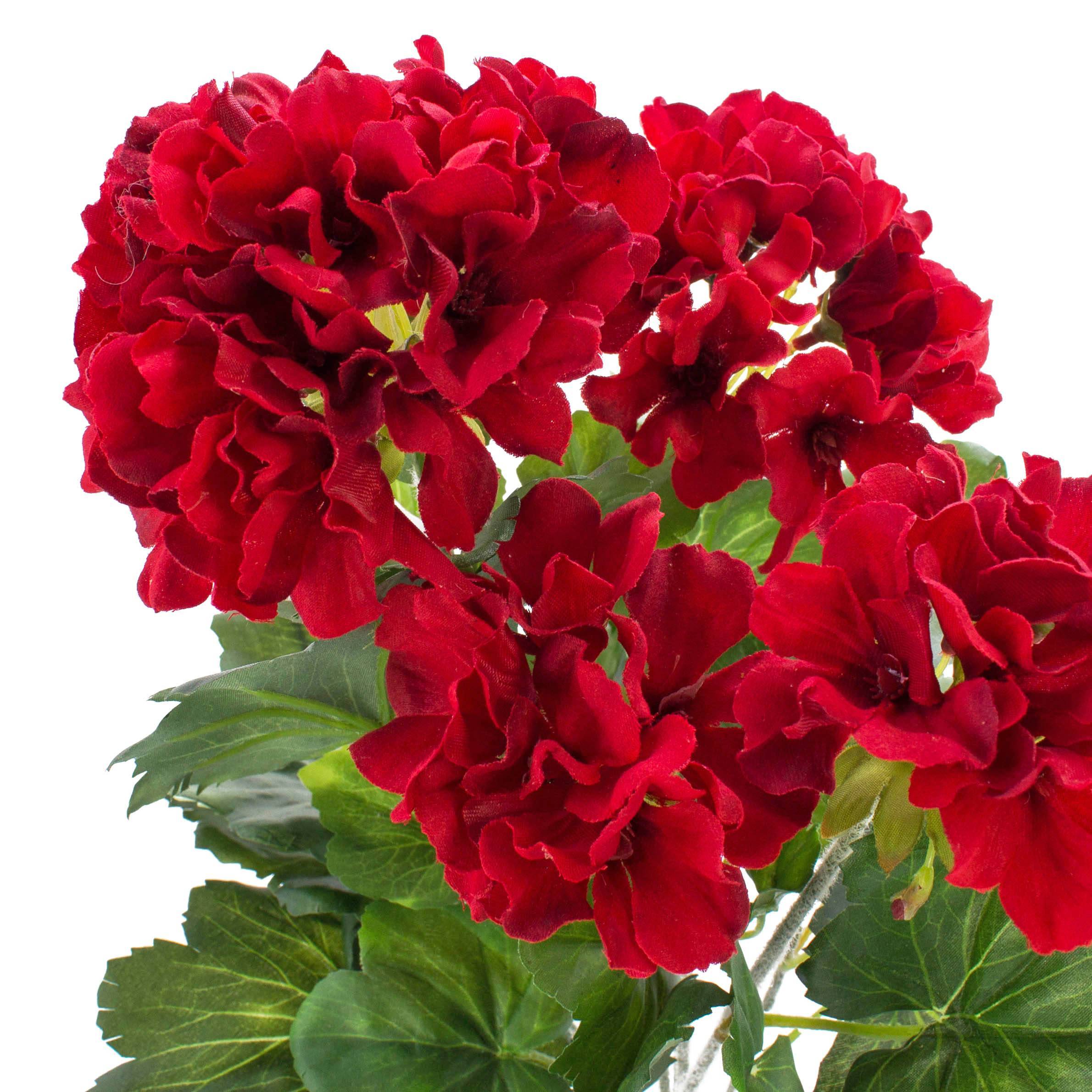 Bonito geranio MAIKE con varilla de ajuste y con 5 flores de color rojo oscuro además de 33 finas hojas verdes. Bonita decoración en maceta para el hogar.