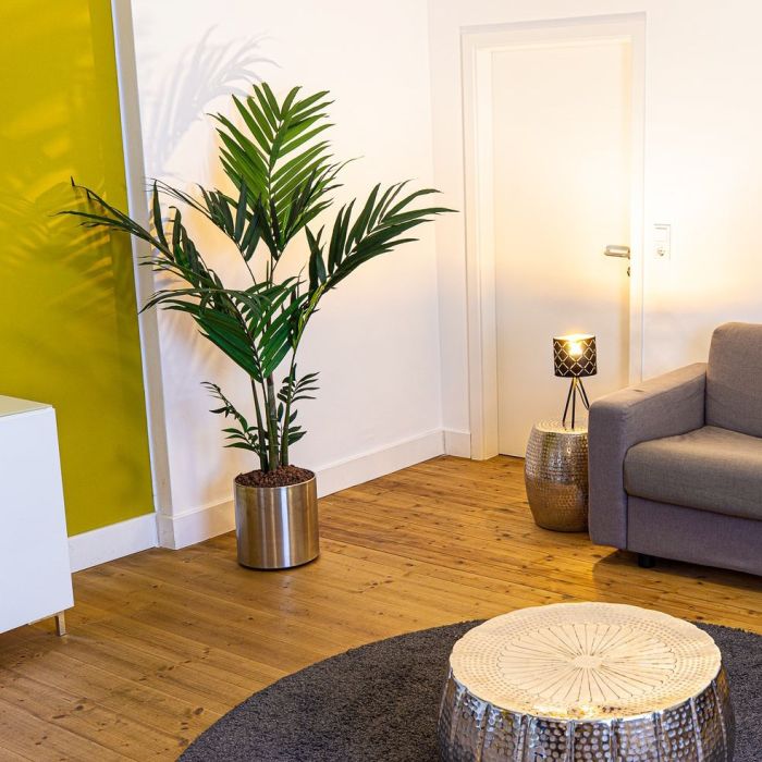 ¡Una compañera de piso tranquila con efecto calmante! Nuestras plantas de interior hacen que todas las habitaciones sean más acogedoras y, gracias a su efecto de sombra, también más confortables. Nuestra palmera encaja en cualquier habitación y aporta un toque acogedor a los rincones apagados. La maceta es un auténtico clásico que encaja en cualquier lugar gracias a su elegante diseño. Lo mejor es que tiene ruedas para que puedas mover tu planta de interior en cualquier momento y sin mucho esfuerzo. Compra el look!