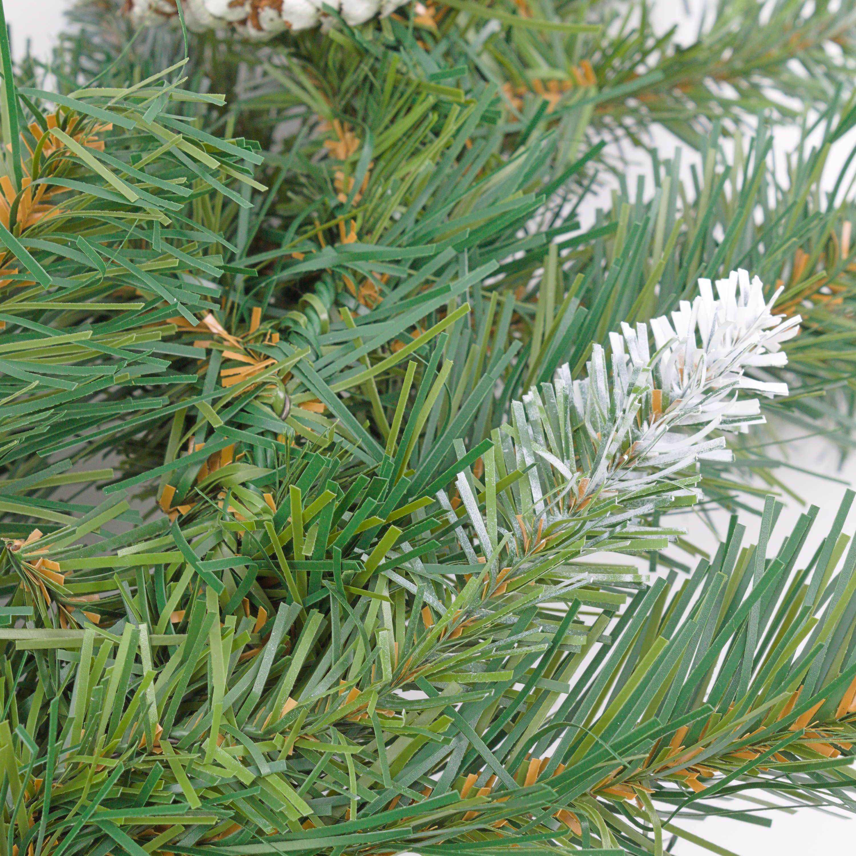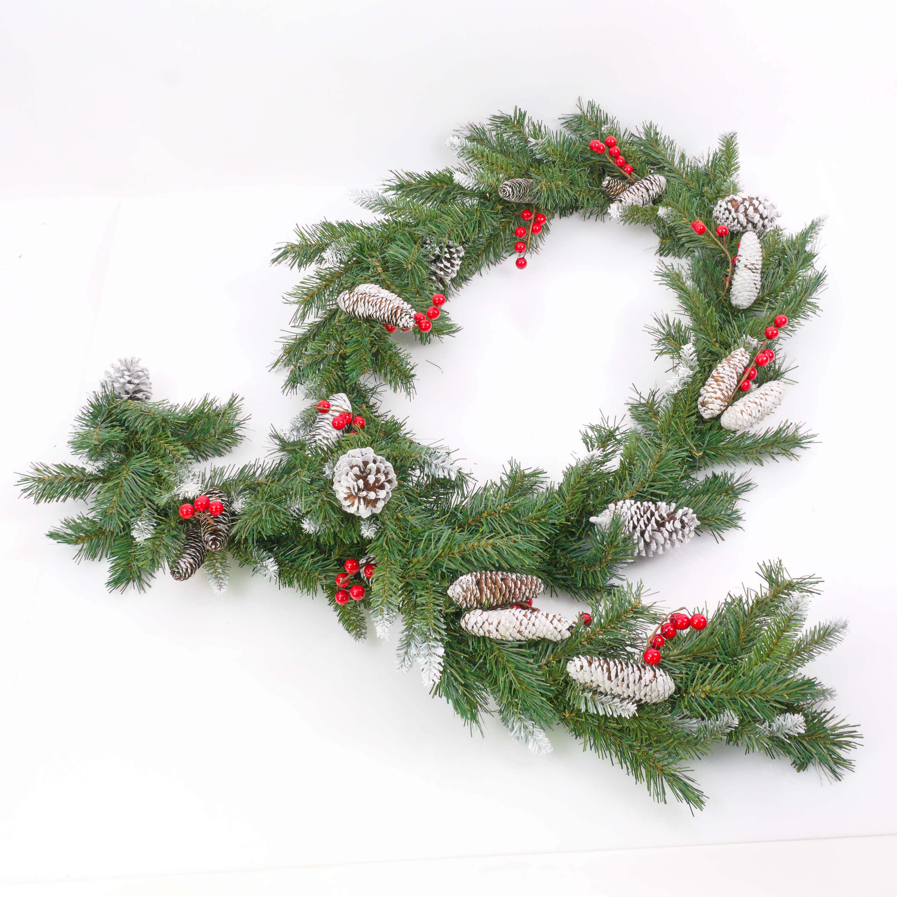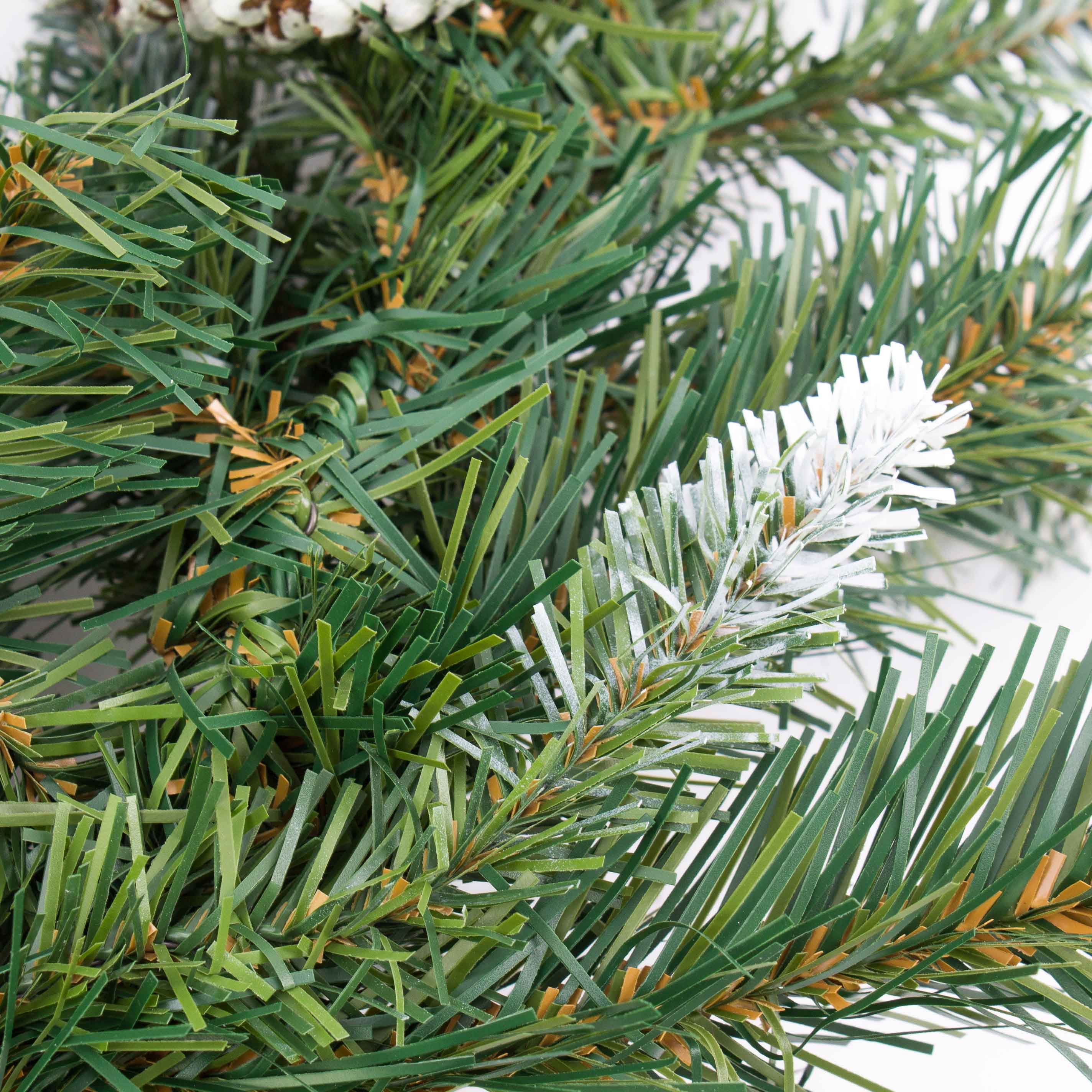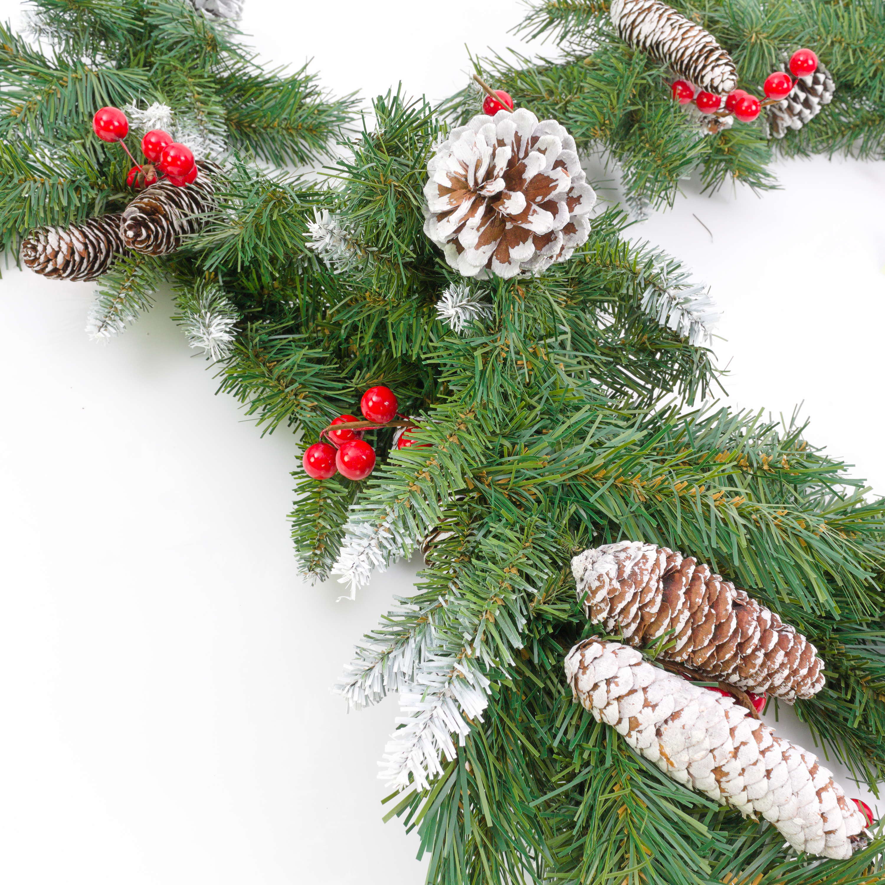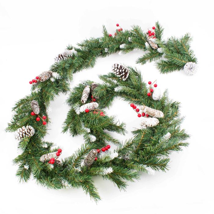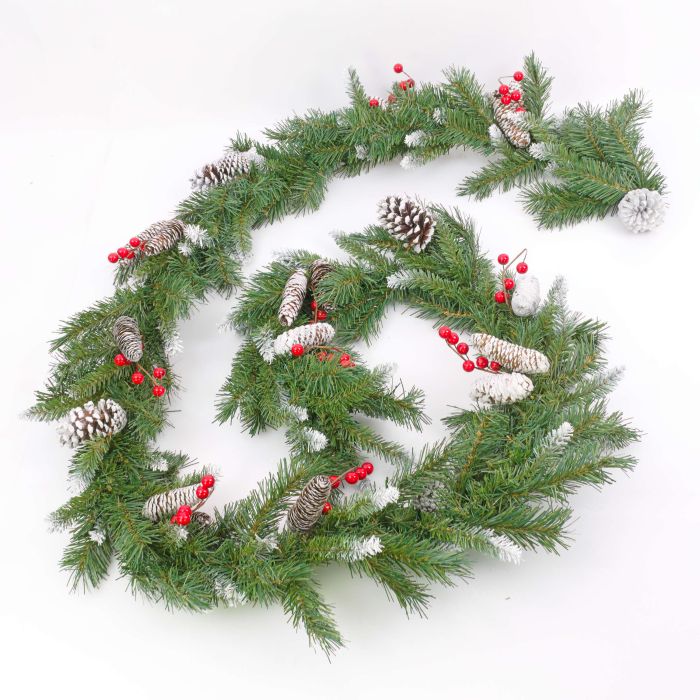 - Con hojas de abeto en color verde oscuro, algunas partes con aspecto de hojas nevadas de textil de alta calidad. Además con bayas de color rojo y con piñas nevadas.