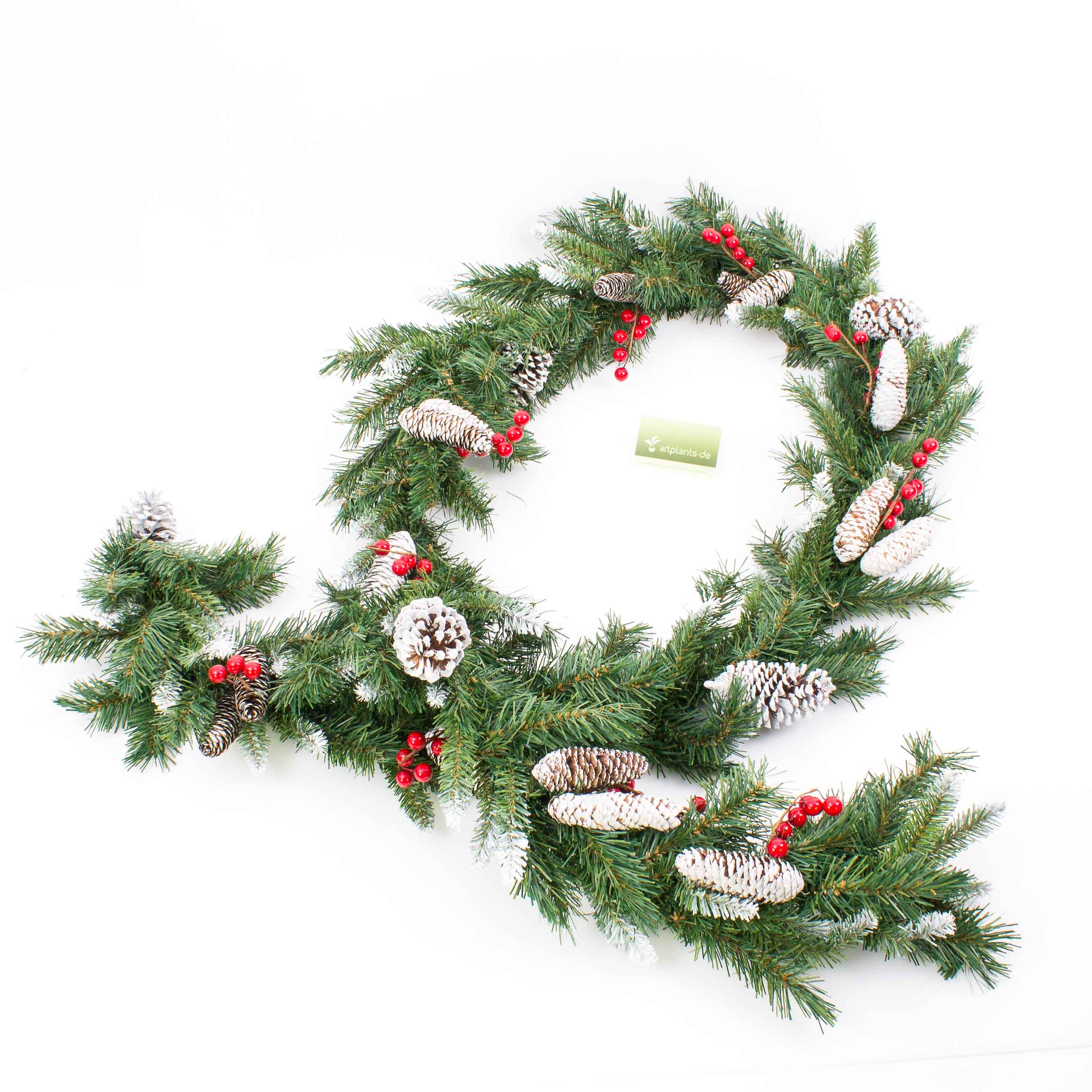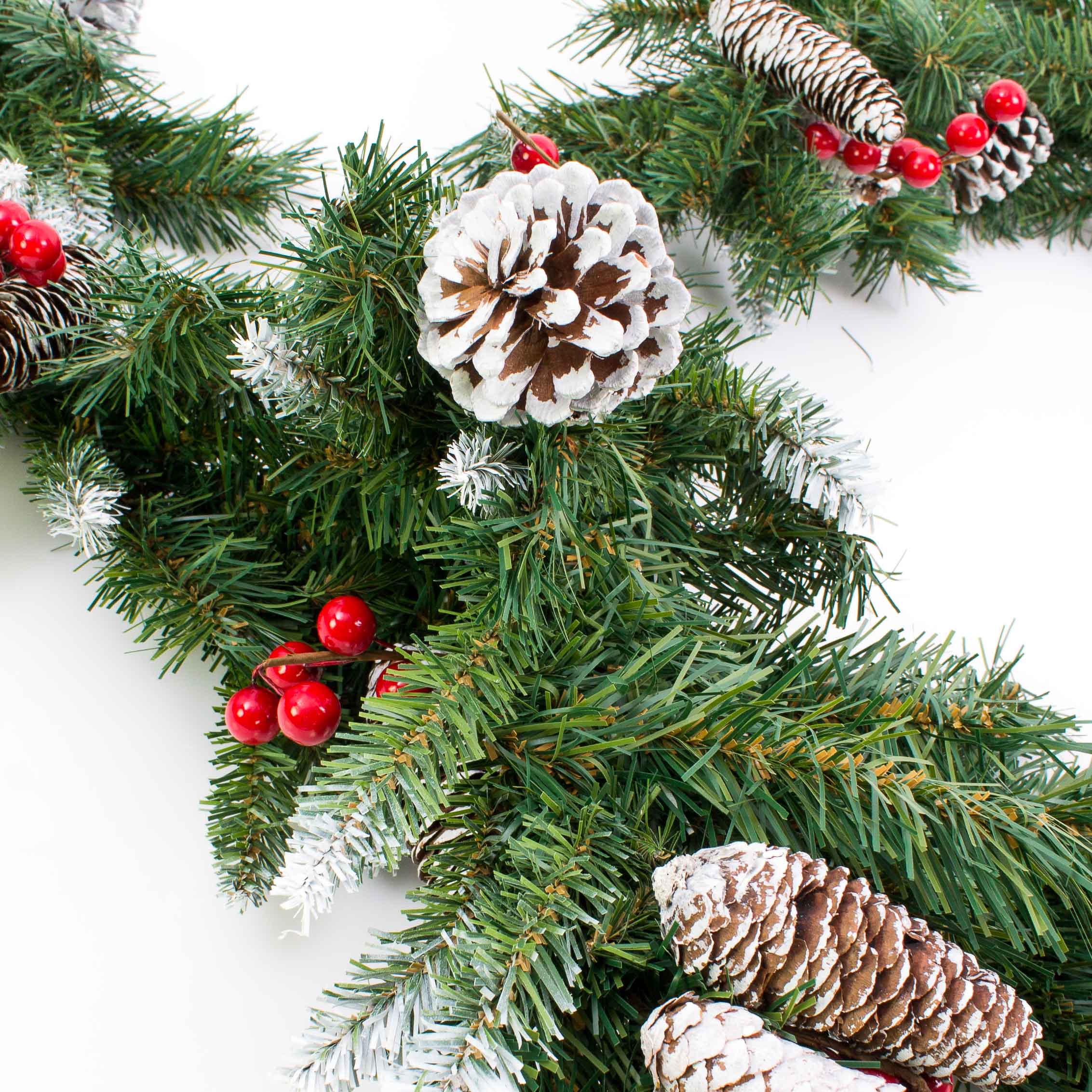 Bonita guirnalda de abeto MARLIES con piñas y bayas rojas. Con sus ramas y piñas con aspecto de nieve artificial es la corona ideal para decoraciones invernales o navideñas.