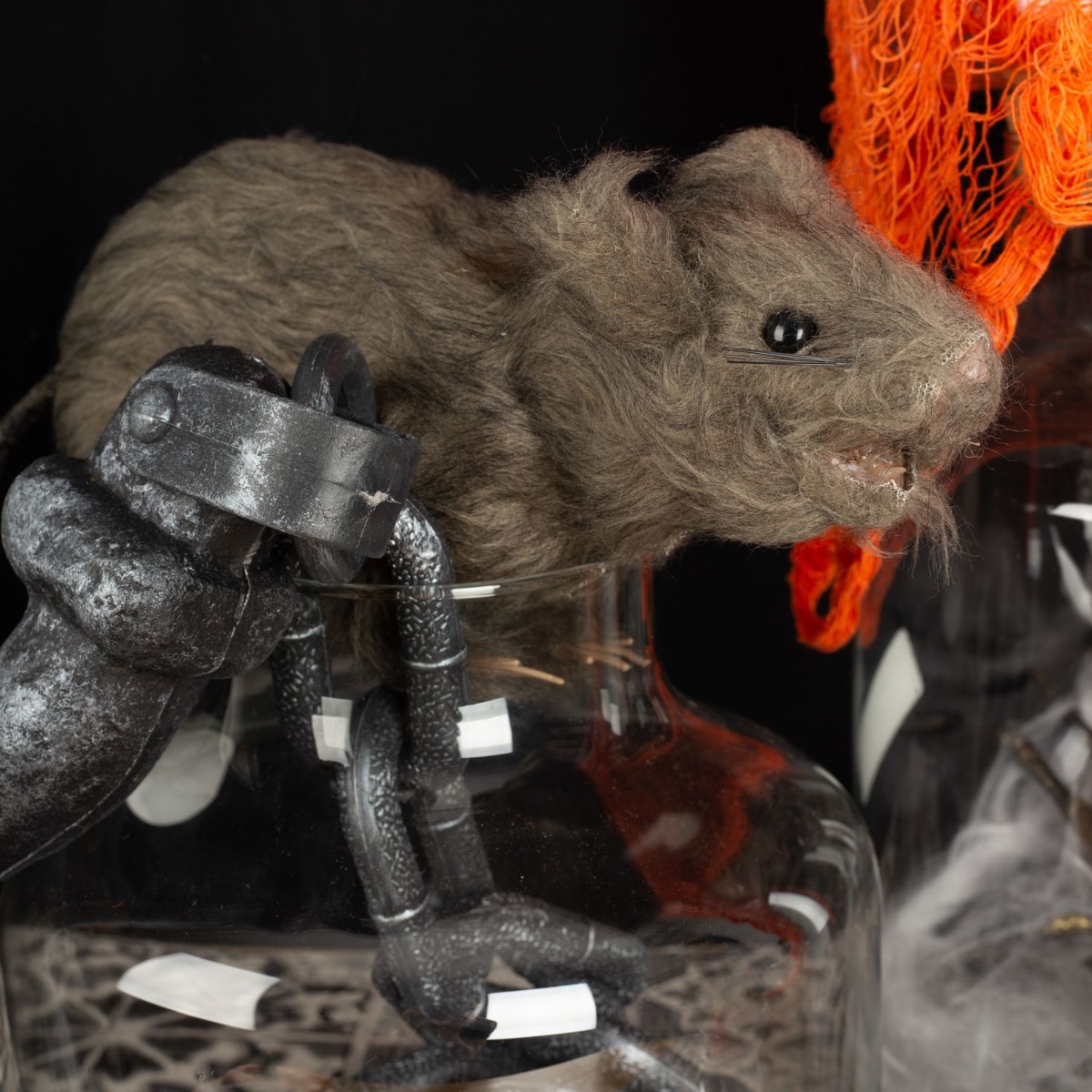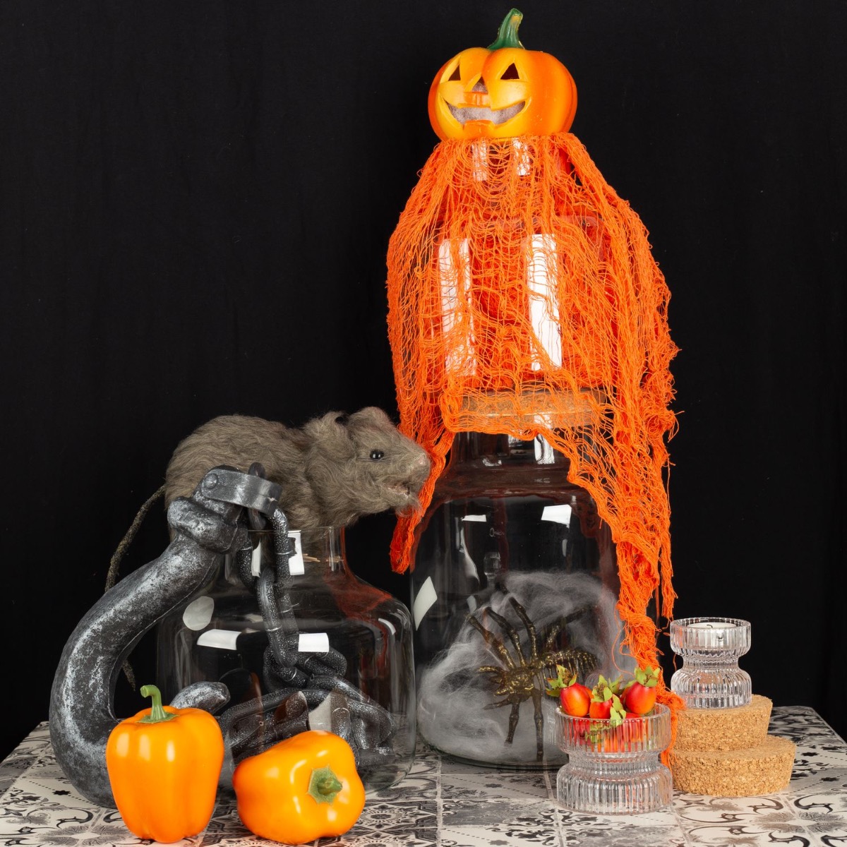 Espeluznante laboratorio! Nuestros botes de almacenamiento pueden transformarse fácilmente en un espeluznante laboratorio para Halloween. Como si un profesor loco hubiera atrapado una araña gigante y la hubiera conservado para sus investigaciones. La rata apenas consigue escapar. Afortunadamente, también hay comida preparada para la rata "Stoffel". ¡Escapemos rápido antes de que vuelva el profesor loco! ¡Compra el look!
