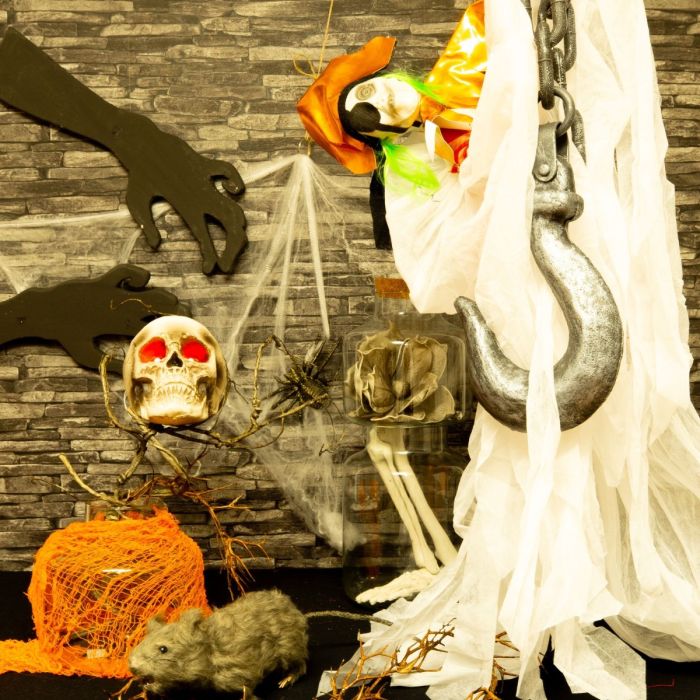 Pirata fantasma y calavera! Si te gustan los piratas te encontrarás con este look, una escena perfecta como sacada de una película. El pirata blanco con túnica fantasma y flecos cuelga del techo de una enorme cadena muy realista. Una calavera con ojos rojos brillantes está rodeada de ramas marrones. Una gran araña se sienta en la tela de araña y una rata aparentemente corre por el cuadro. Los grandes tarros de almacenamiento son perfectos para llenarlos con diversos objetos pequeños, en nuestro caso una pata de esqueleto y una flor de espuma de plástico. Una fiesta temática pirata de Halloween perfecta. ¡Compra el look!
