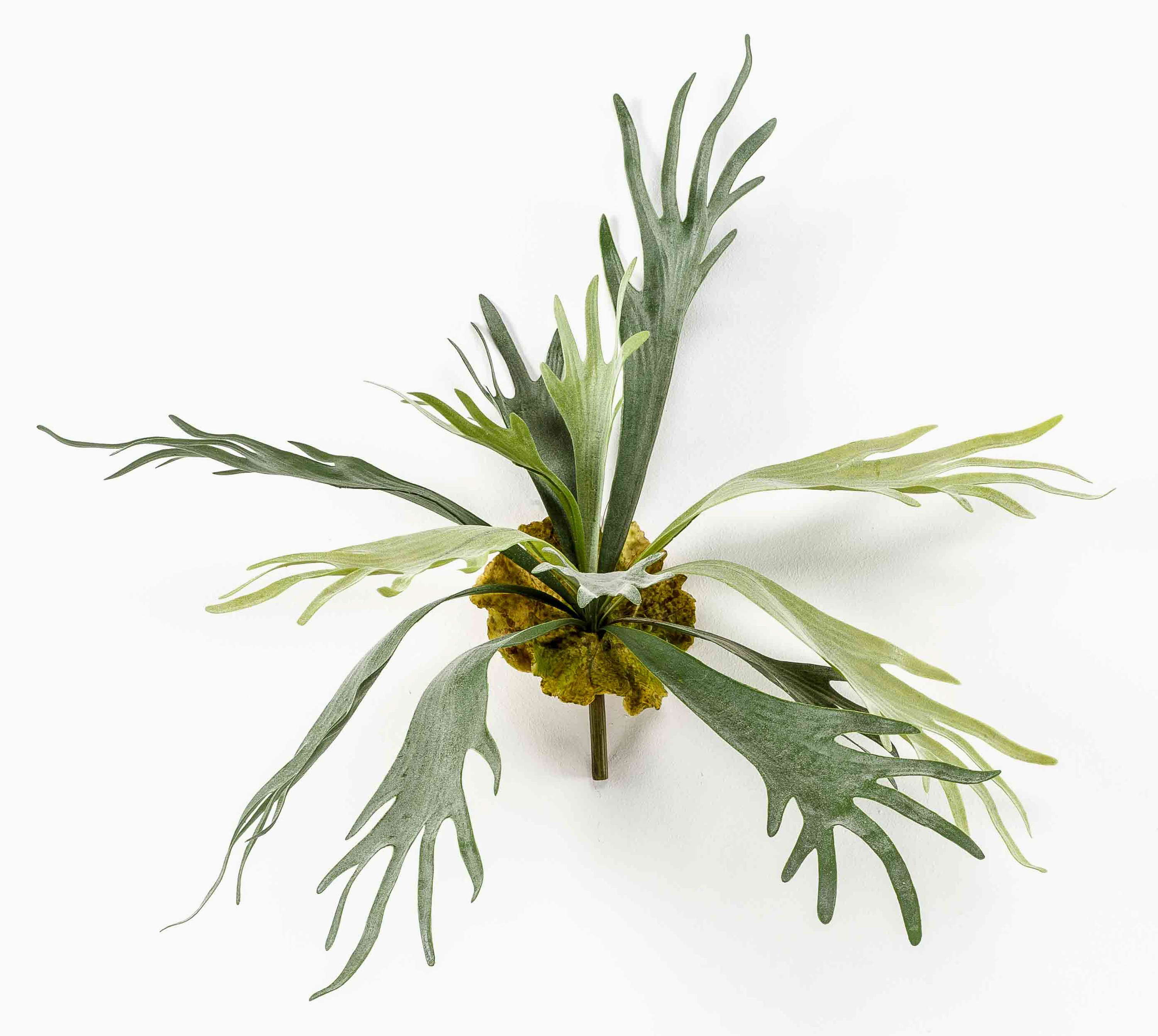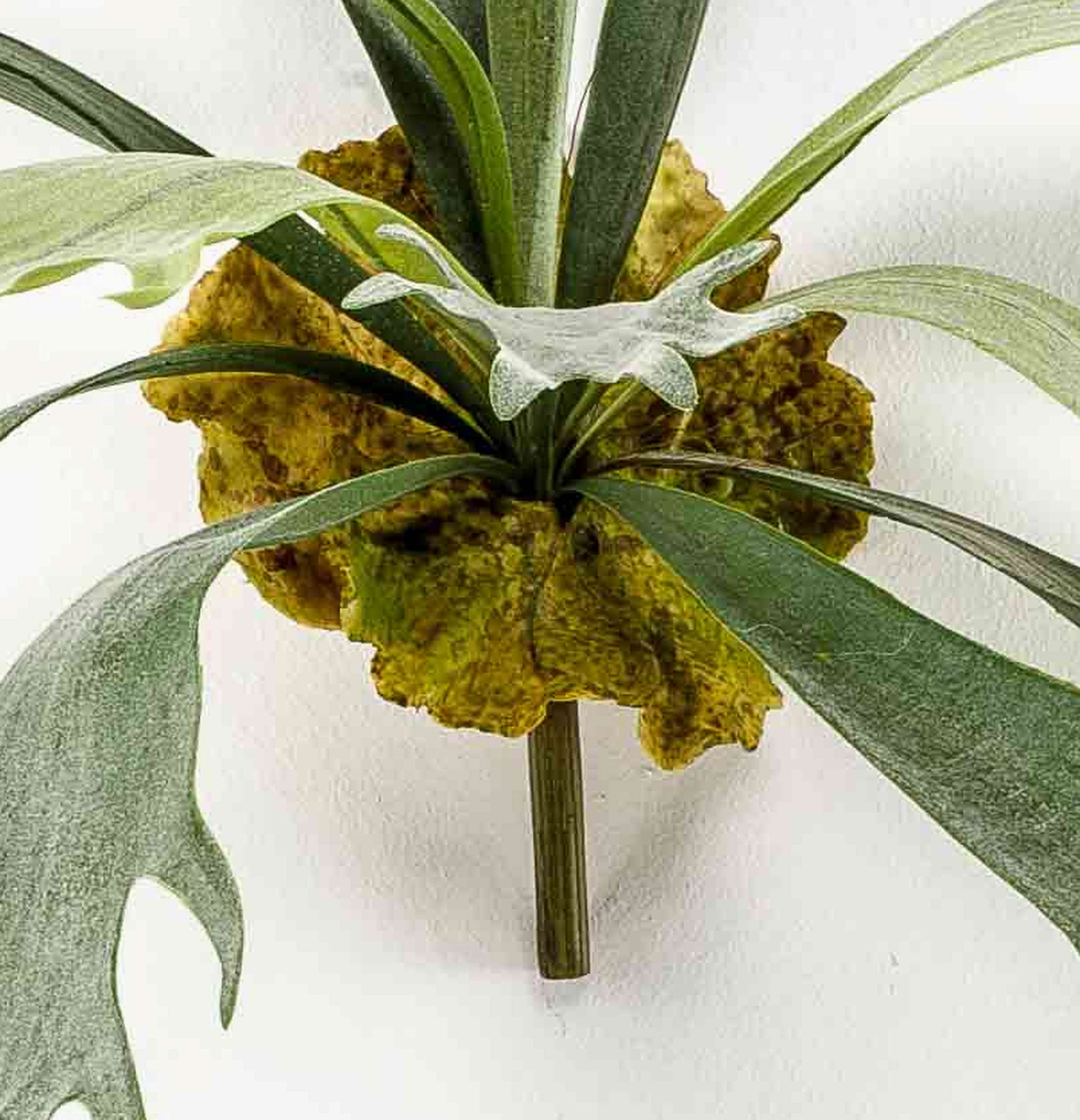 - Con 13 hojas / frondas de helecho en color verde claro y oscuro, algunas hojas redondas marrones en la base