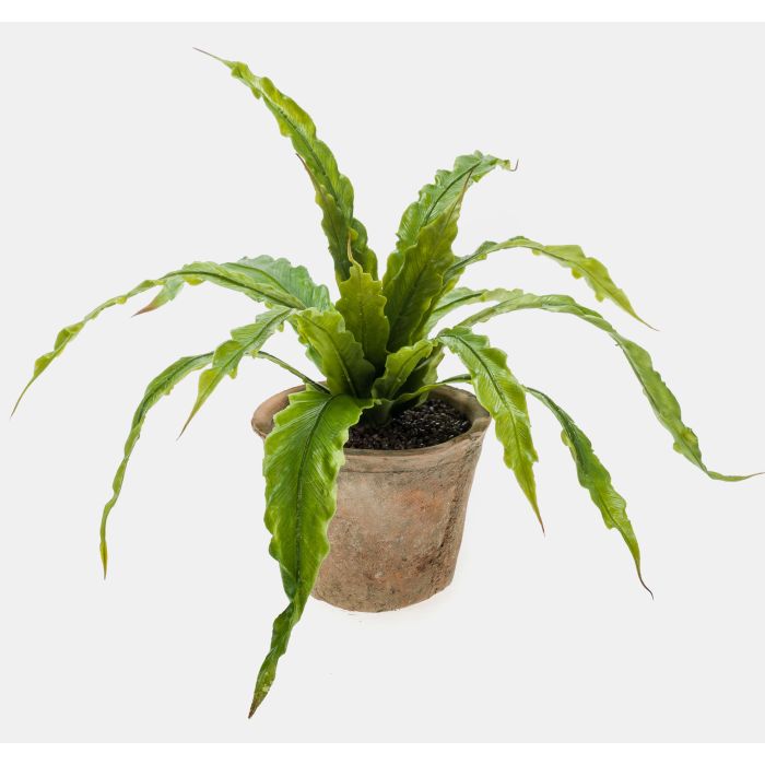 El helecho Asplenium FRANNY hecho de plástico de alta calidad ofrece una imagen llamativa con sus hojas anchas y ligeramente onduladas. En la maceta de terracota adorna pequeñas mesas en coctelerías, heladerías o bares en un instante.