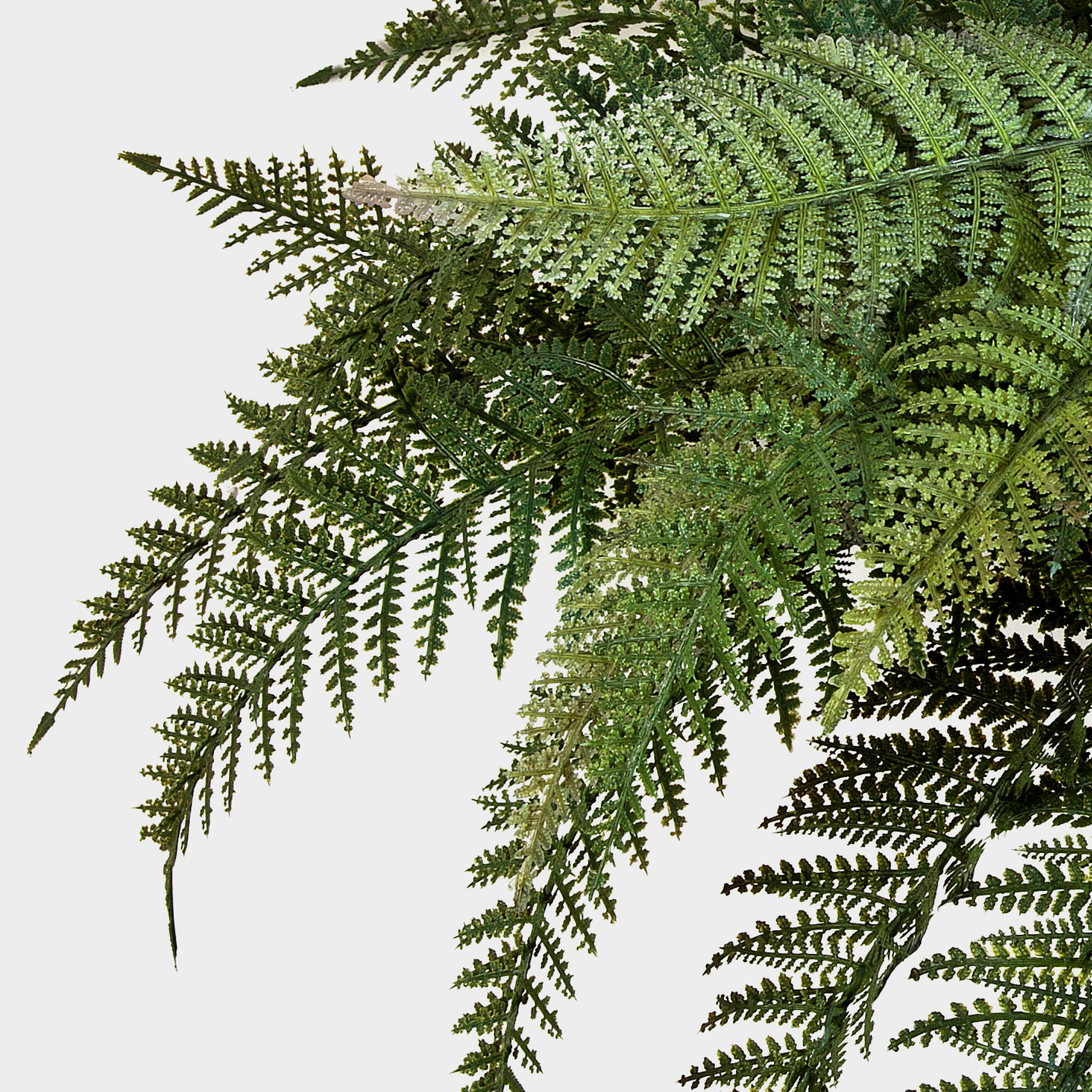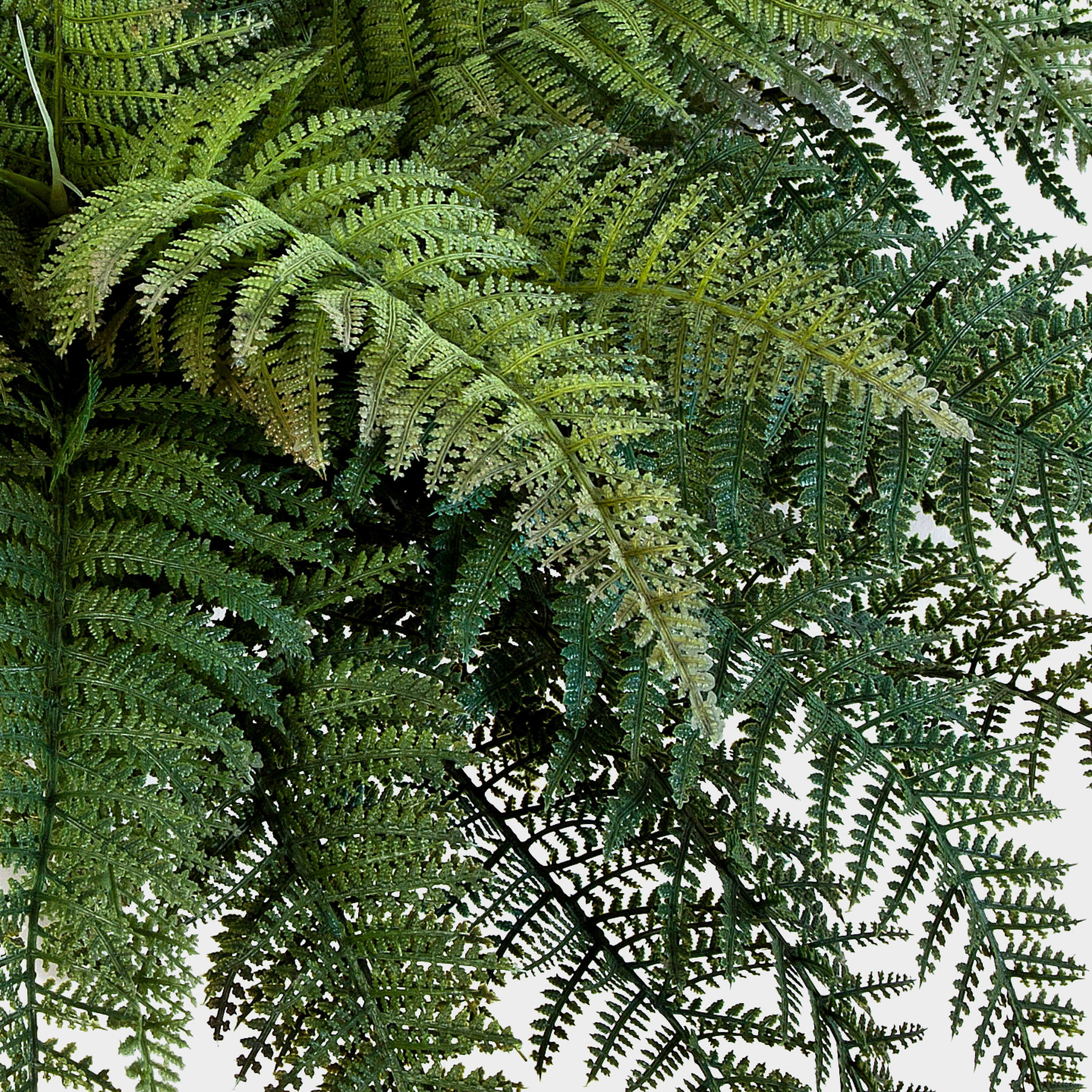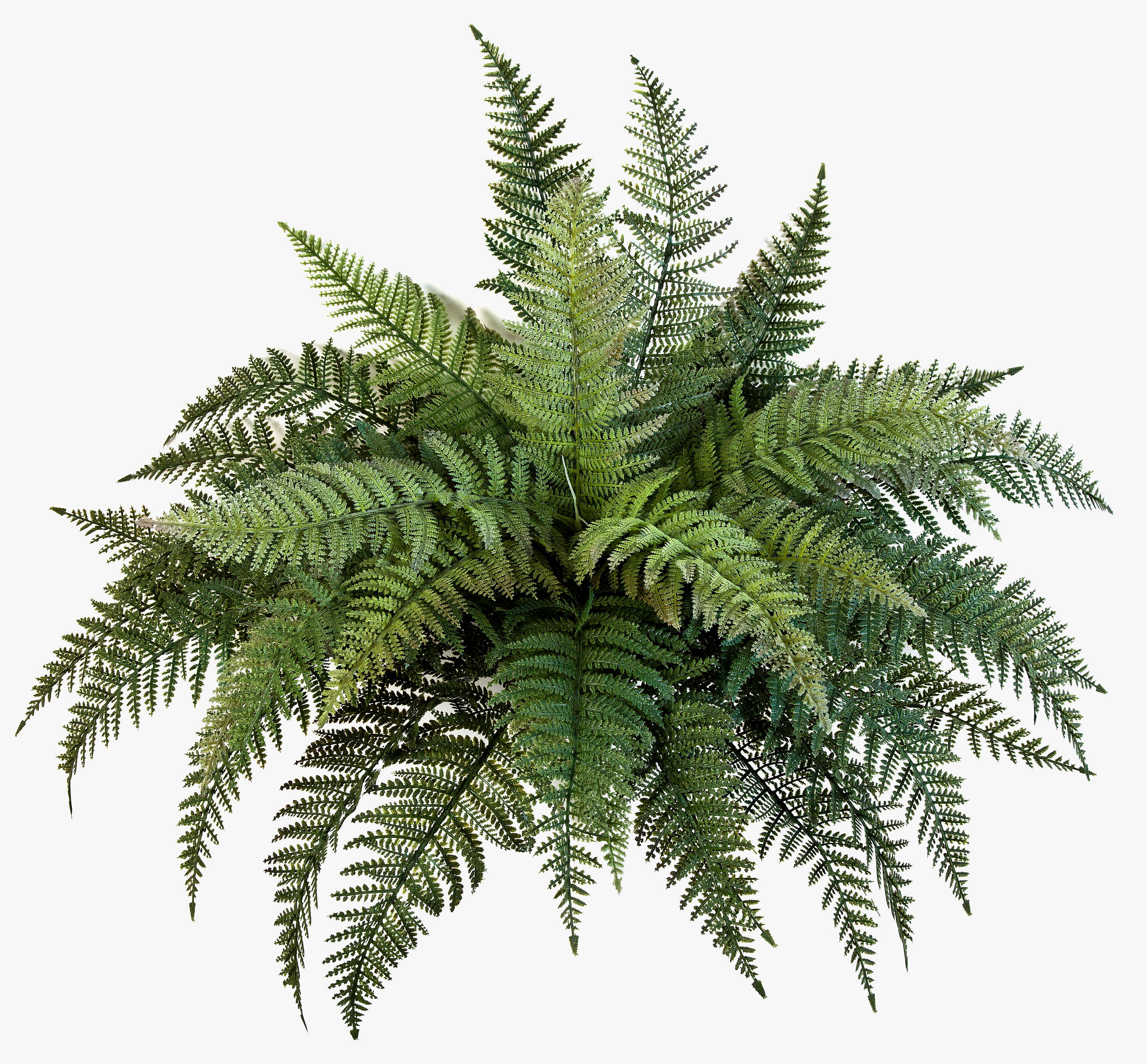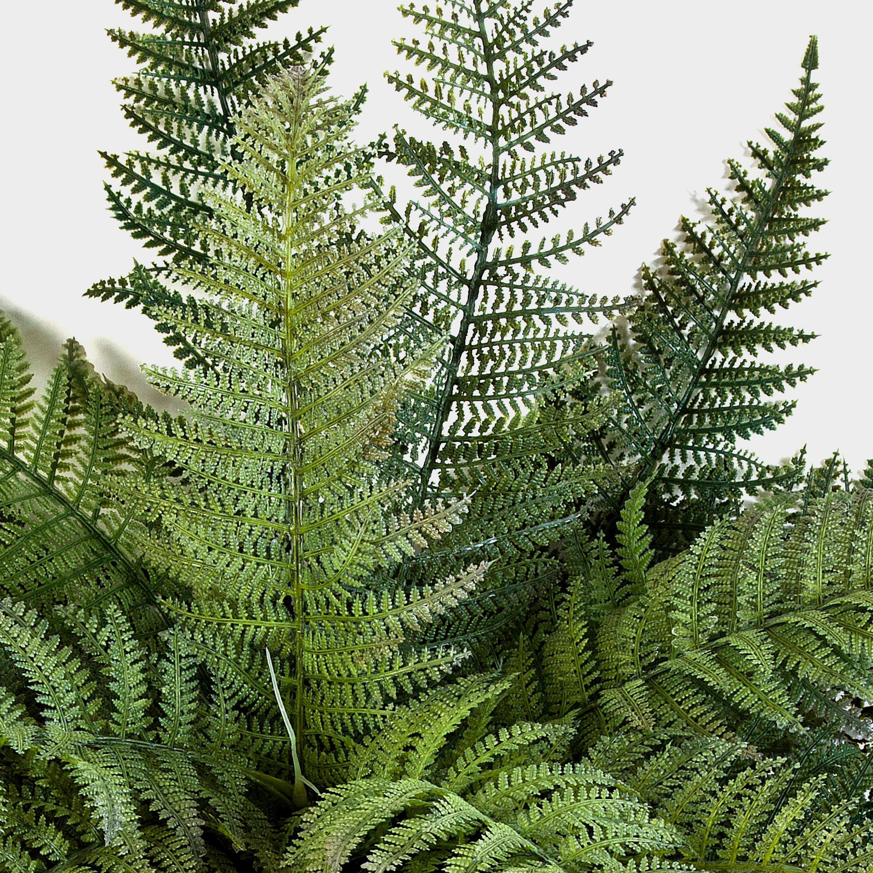 Arbusto de helecho artificial con cerca de 35 hojas en color verde. El helecho real posee una altura aproximada de 50 cm y tiene un diámetro de 65 cm.