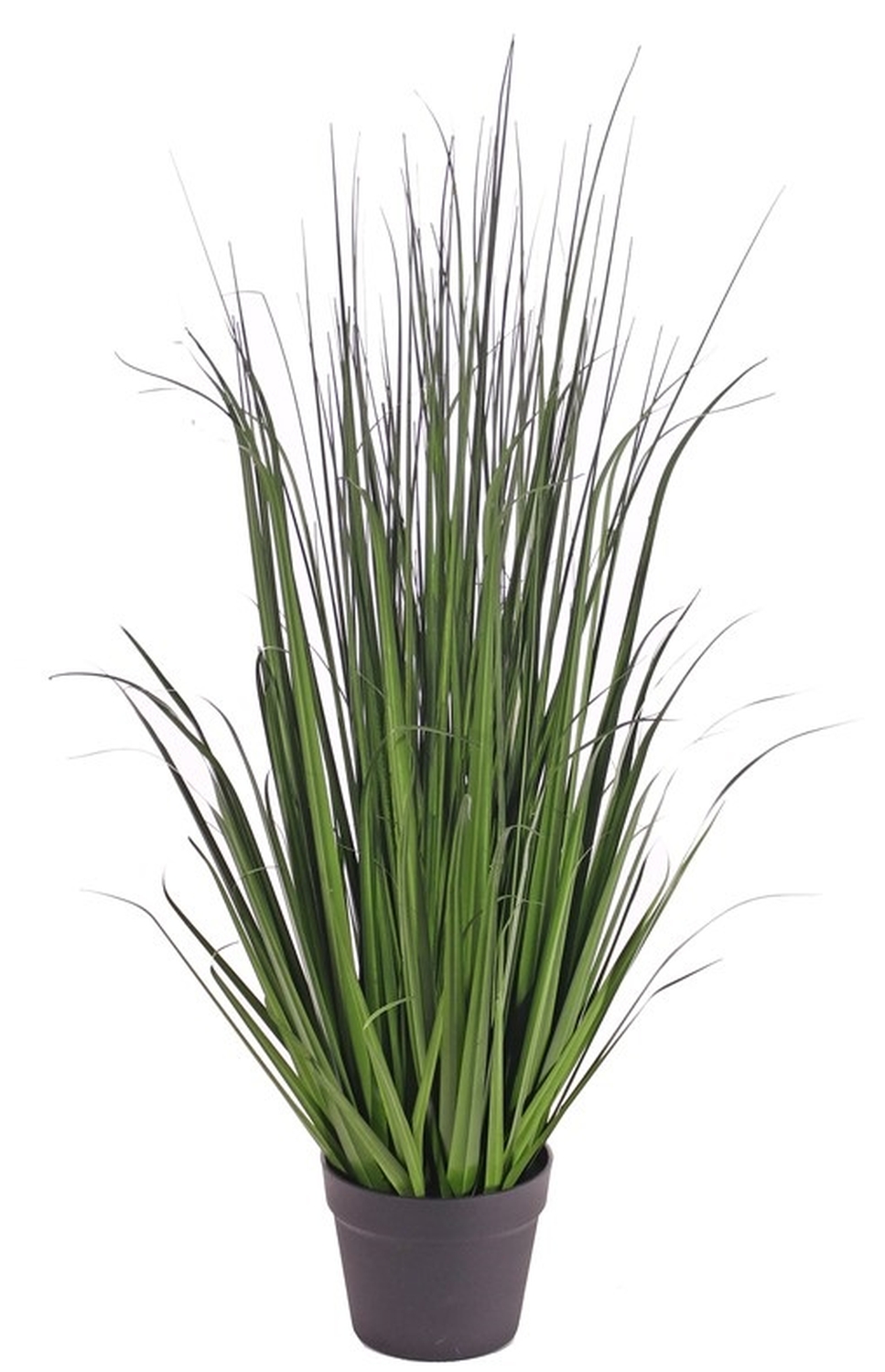 La hierba falsa ALEXANDRINA de color verde posee una dimensión total de aprox. 90 cm y se encuentra fijada a una maceta interior.
