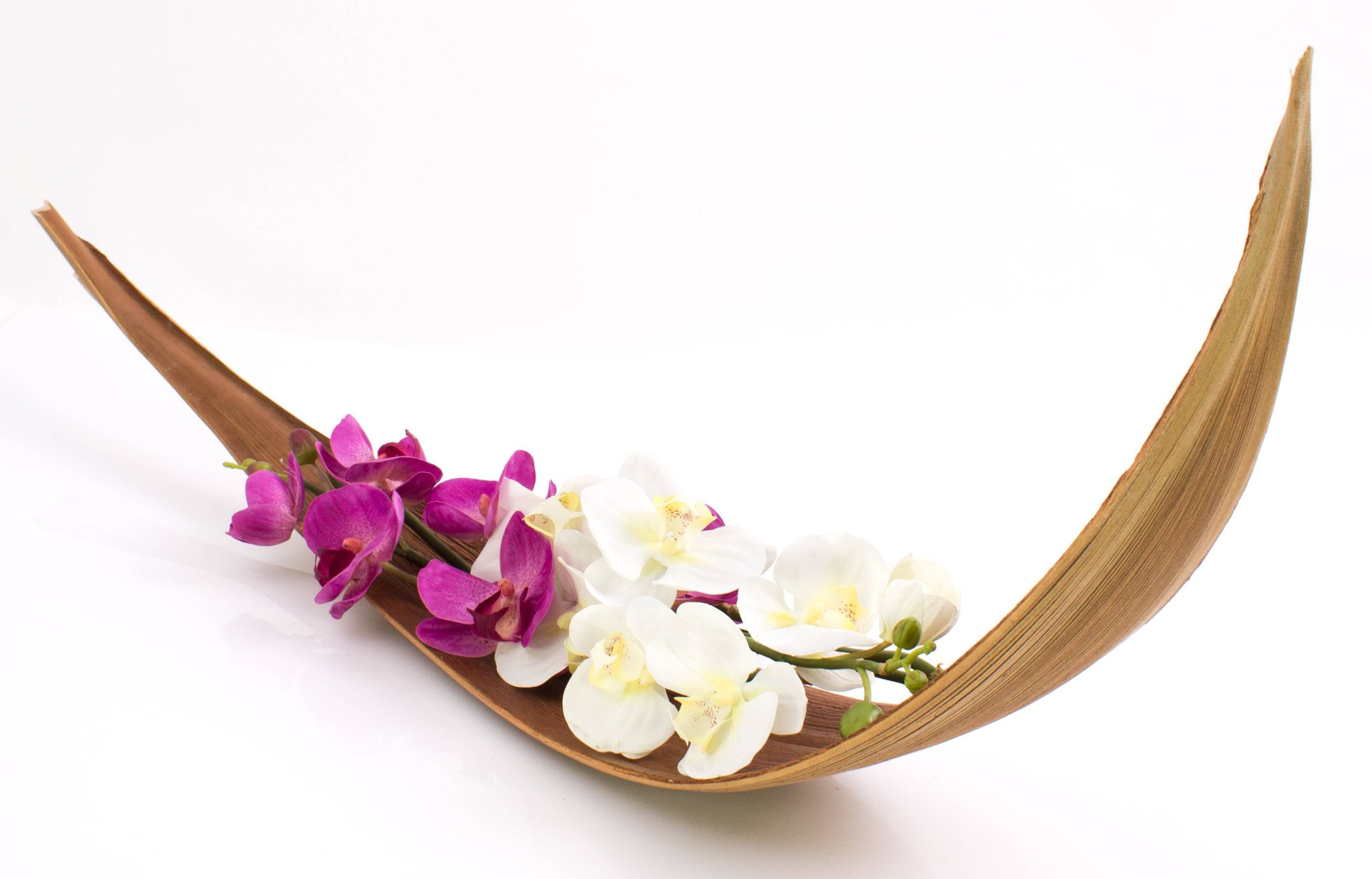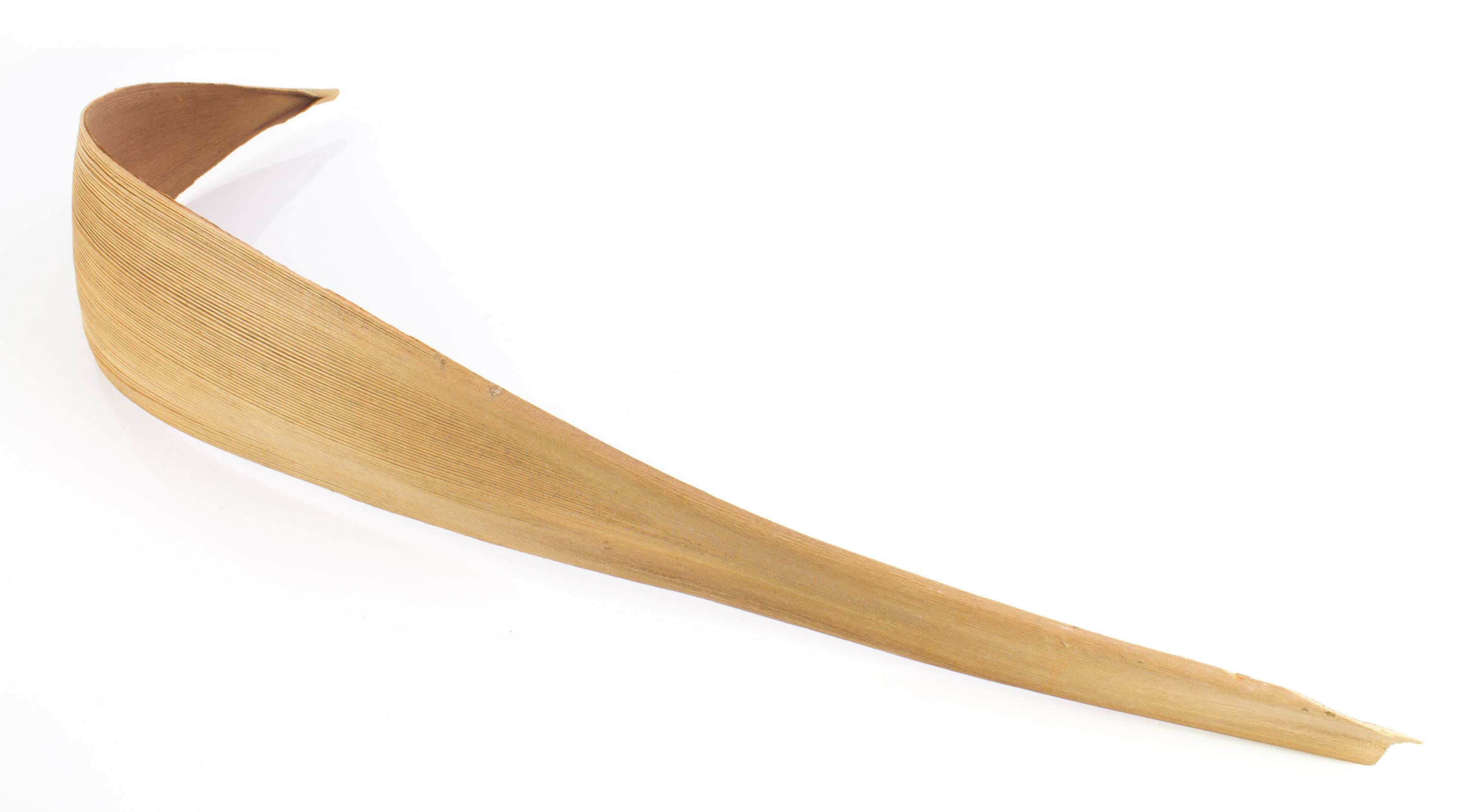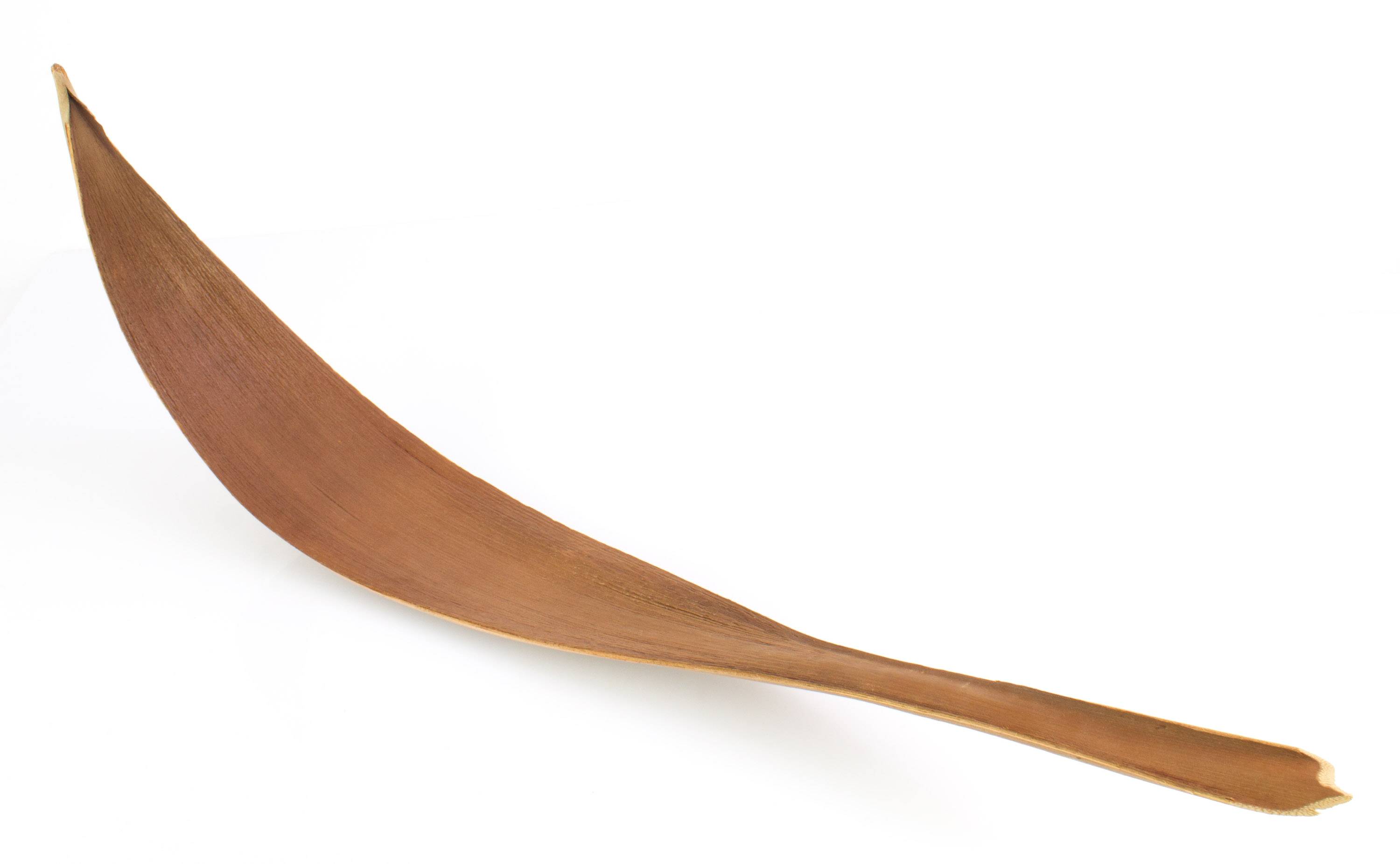 Hoja de coco seca con una longitud aproximada de 115 cm. La curvada hoja se conserva naturalmente y permanece en la posición mostrada en la foto por si sola. Debido a que se trata de un articulo único, cada hoja posee una única forma y color.