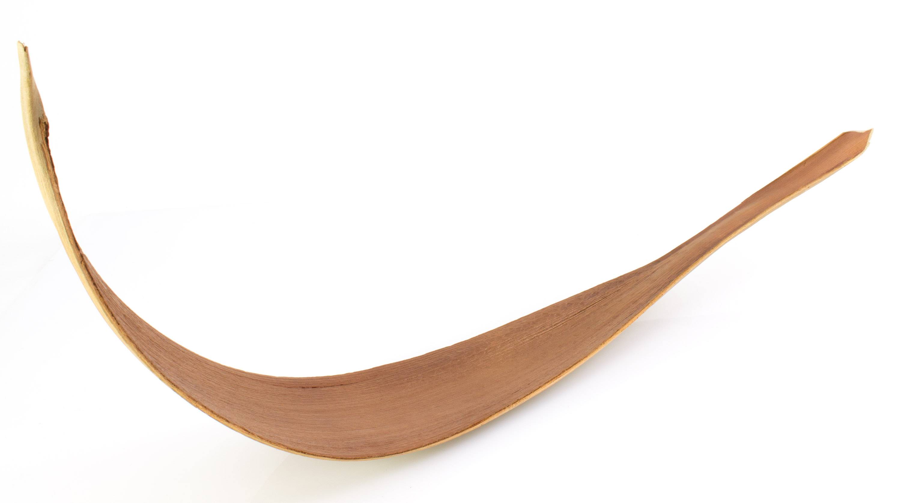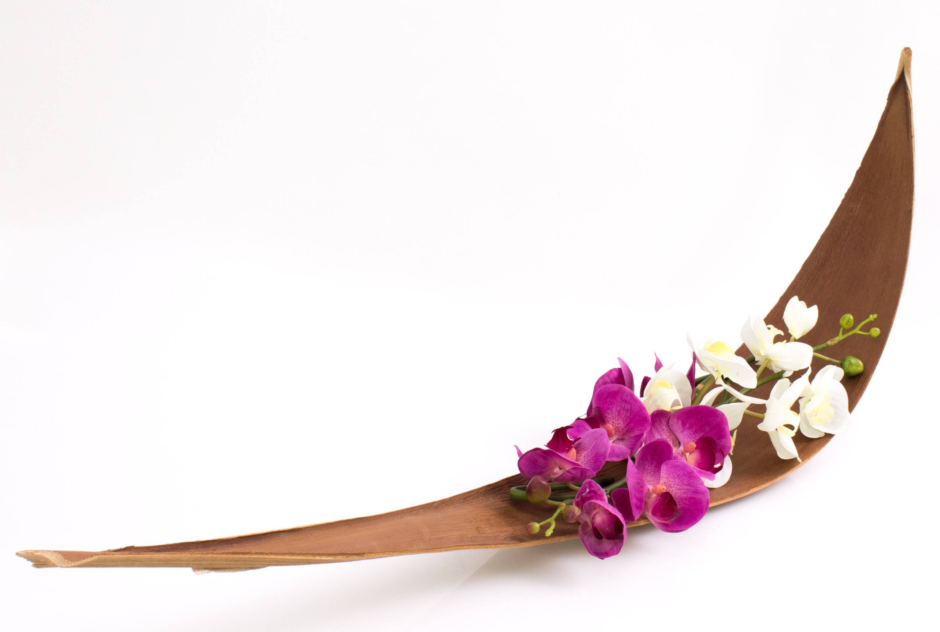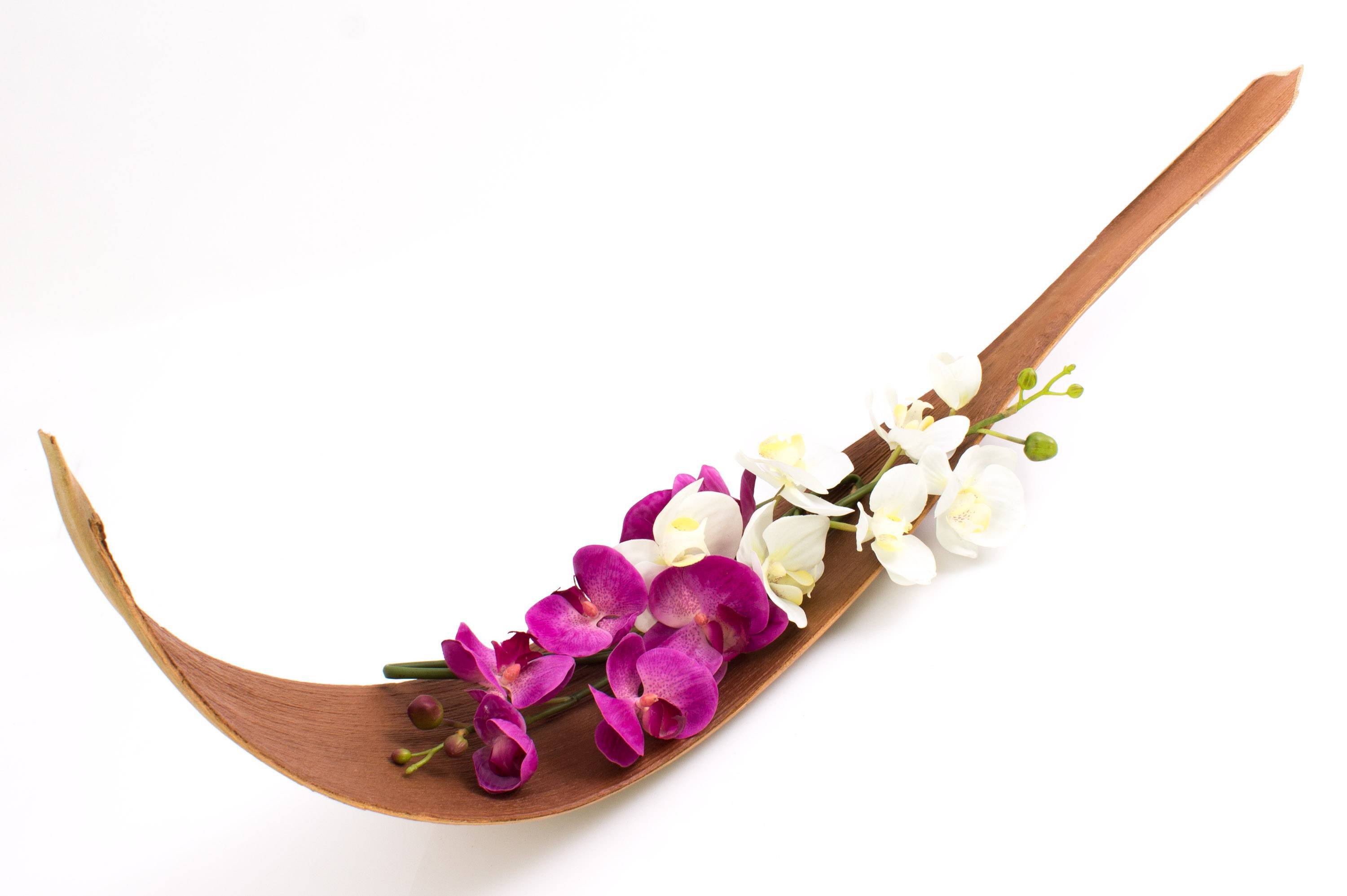 Hoja de coco seca con una longitud aproximada de 115 cm. La curvada hoja se conserva naturalmente y permanece en la posición mostrada en la foto por si sola. Debido a que se trata de un articulo único, cada hoja posee una única forma y color.