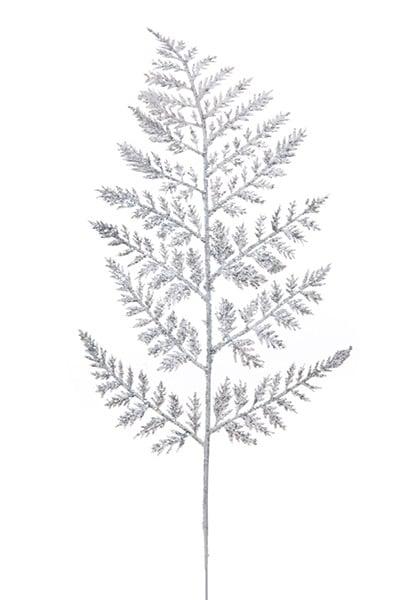 - Hoja de helecho finamente tallada con delicados extremos de hoja en forma de pluma y purpurina
