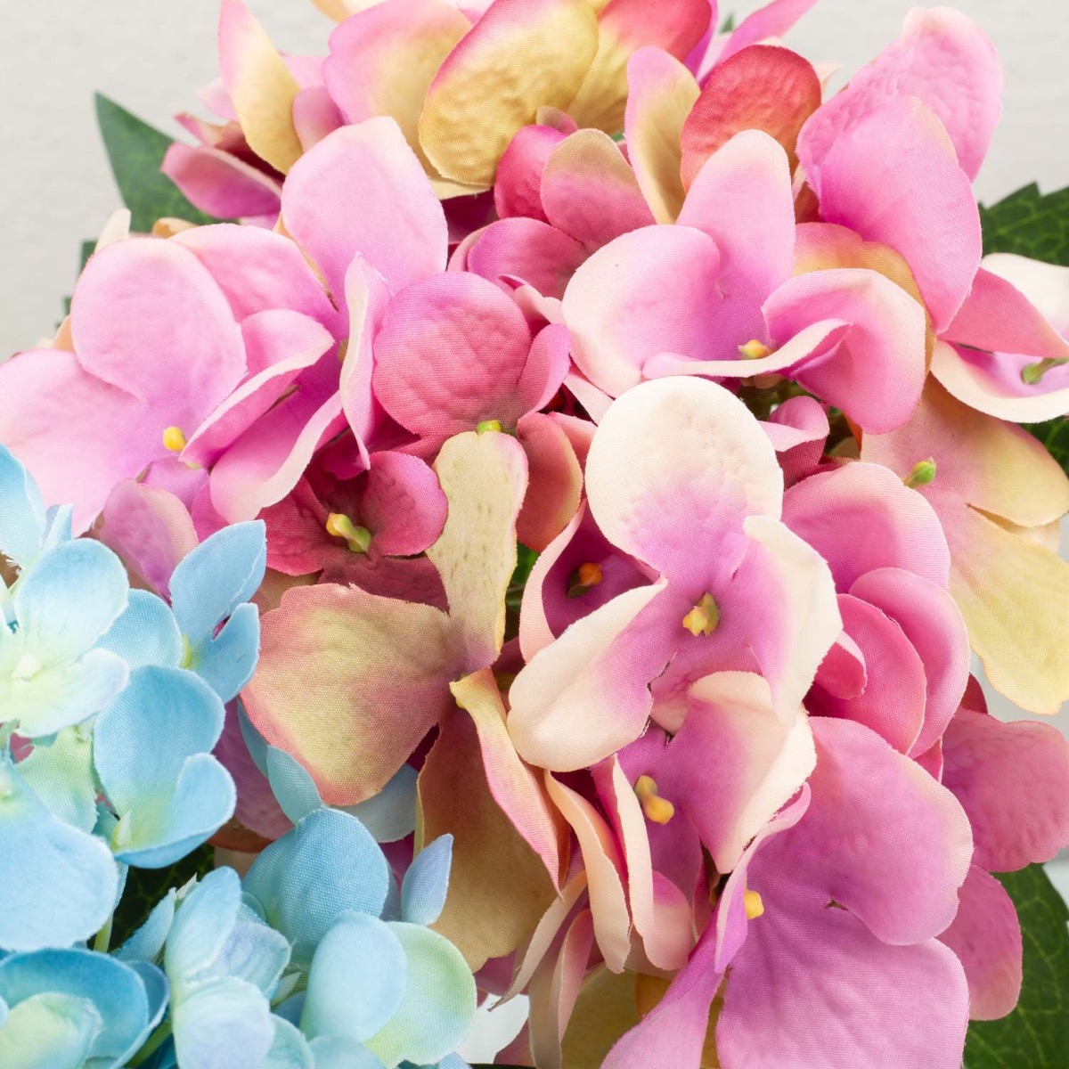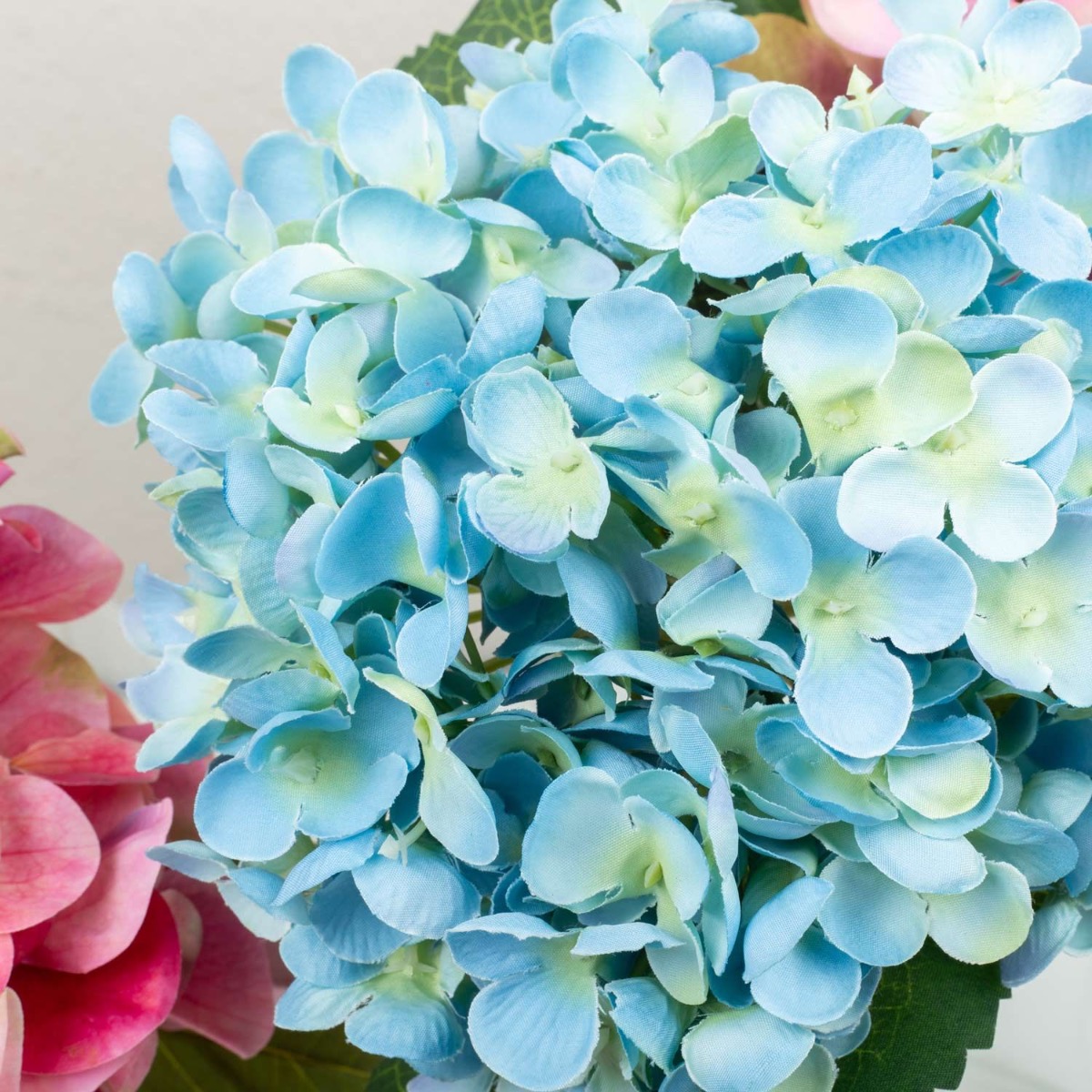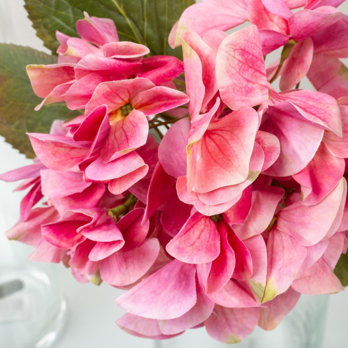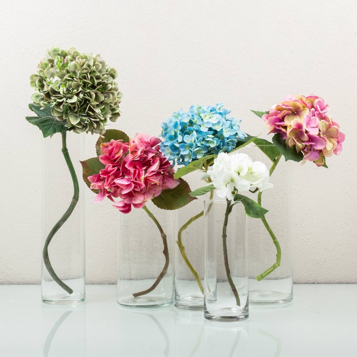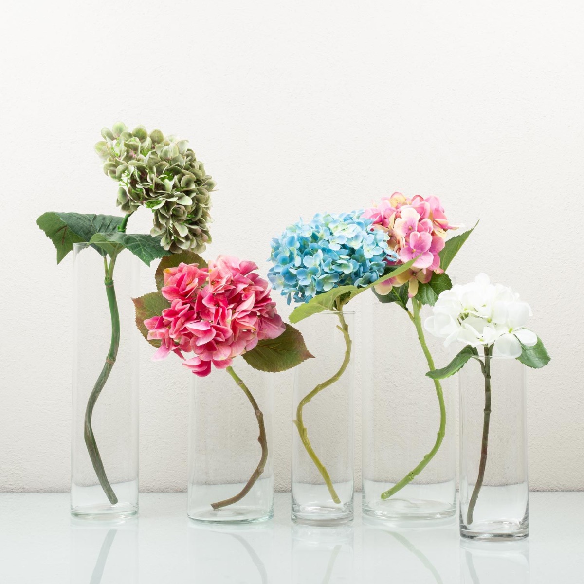 ¡Maravillosa flor esférica! Las hortensias deleitan con sus exuberantes umbelas florales, que crecen a partir de muchas flores pequeñas. Este look es la decoración de verano perfecta porque luce refrescante y muestra los colores típicos del pleno verano. Los jarrones cilíndricos en diferentes longitudes y diámetros le dan un aspecto elegante y purista Compra el look