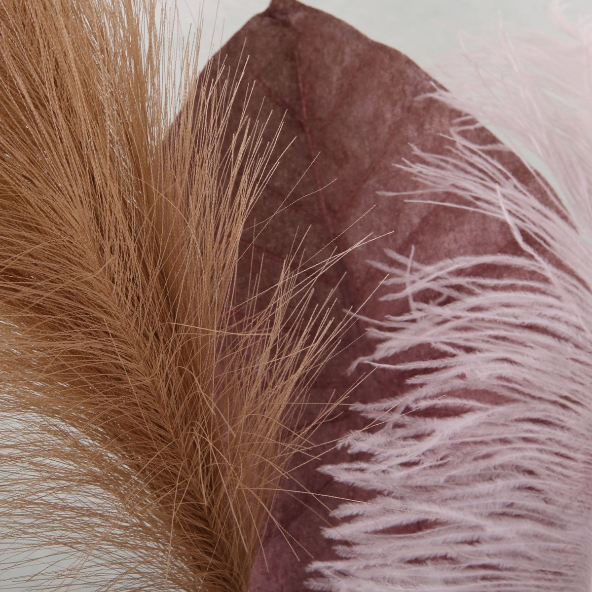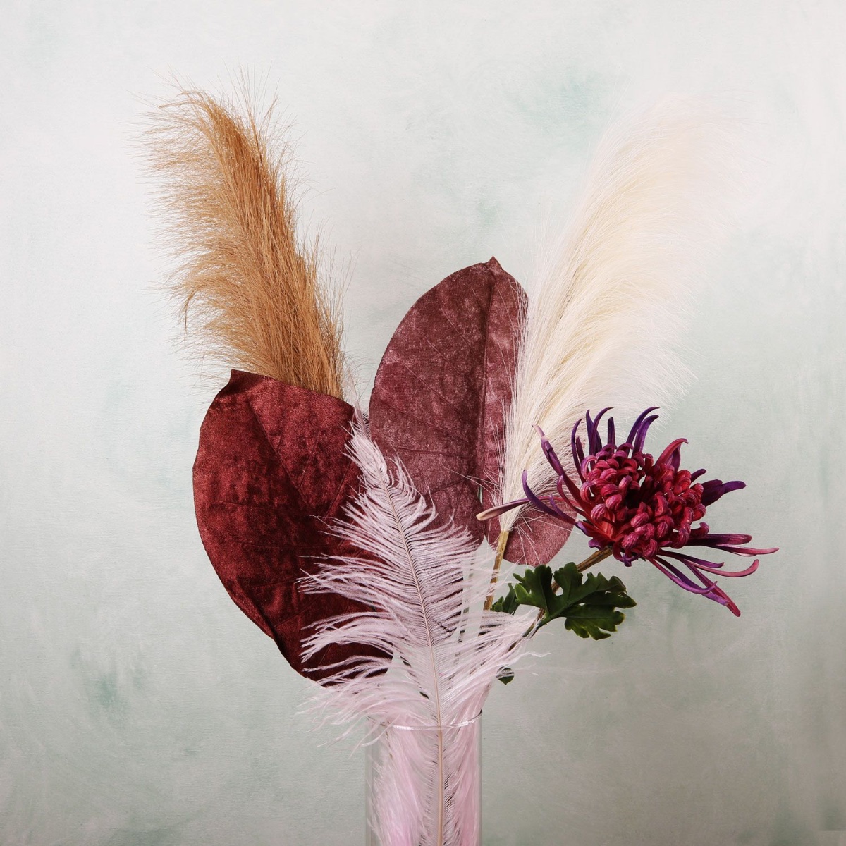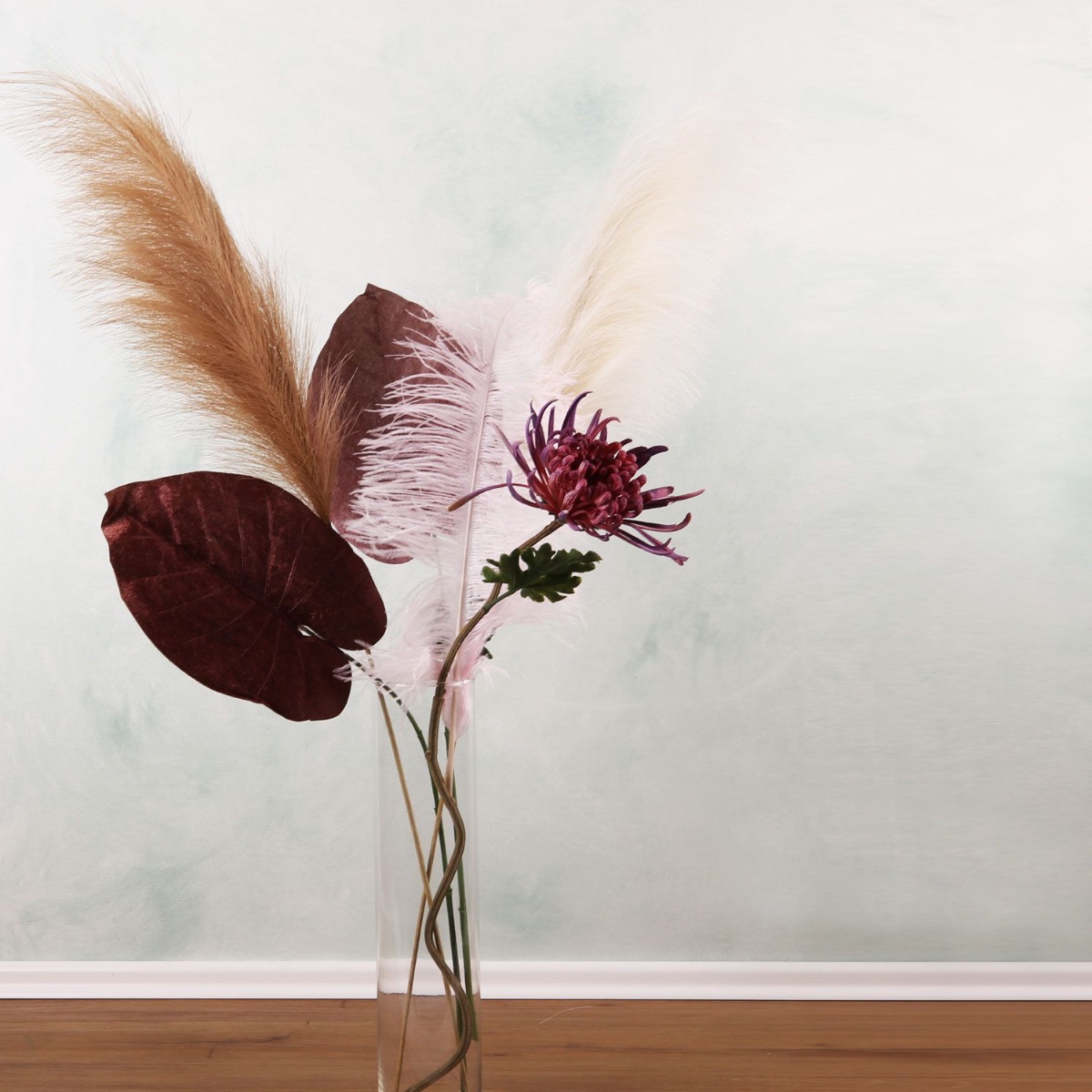 ¡Pieles y terciopelo! Por fin se acaba el verano y los días oscuros cambian nuestro estado de ánimo. Las tardes en casa se alegran con una taza de té o cacao caliente y se puede contemplar la caída de las hojas otoñales. Este look otoñal crea un ambiente acogedor en tu salón. Las hojas aterciopeladas, la hierba de stipa y las auténticas plumas de avestruz son tan suaves que querrás acurrucarte junto a ellas. Pero un crisantemo morado te lo impedirá. Compra el look!