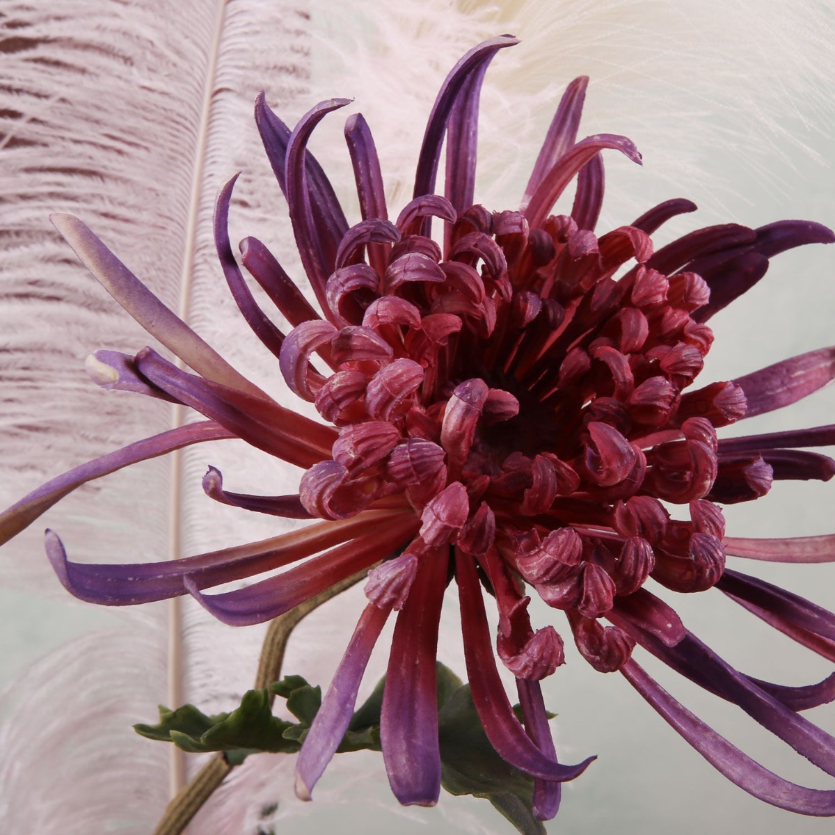 Consejo de diseño: Dobla el tallo del crisantemo en espiral para que quepa en el jarrón. Dobla las hojas ligeramente hacia fuera. Coloca la pluma y la hierba de stipa así.