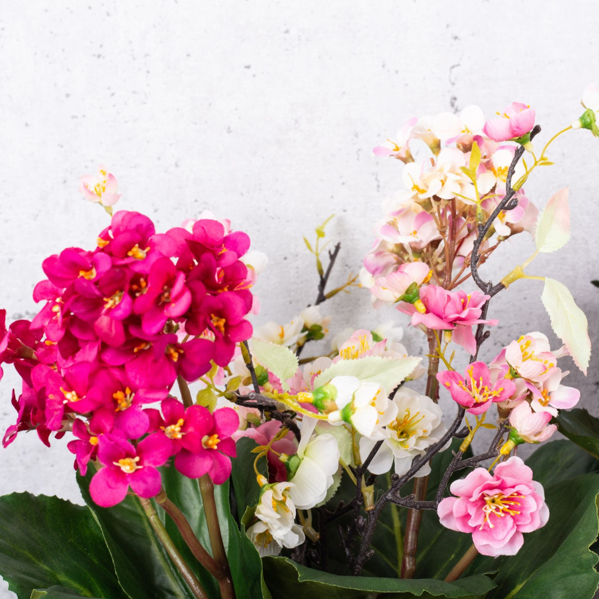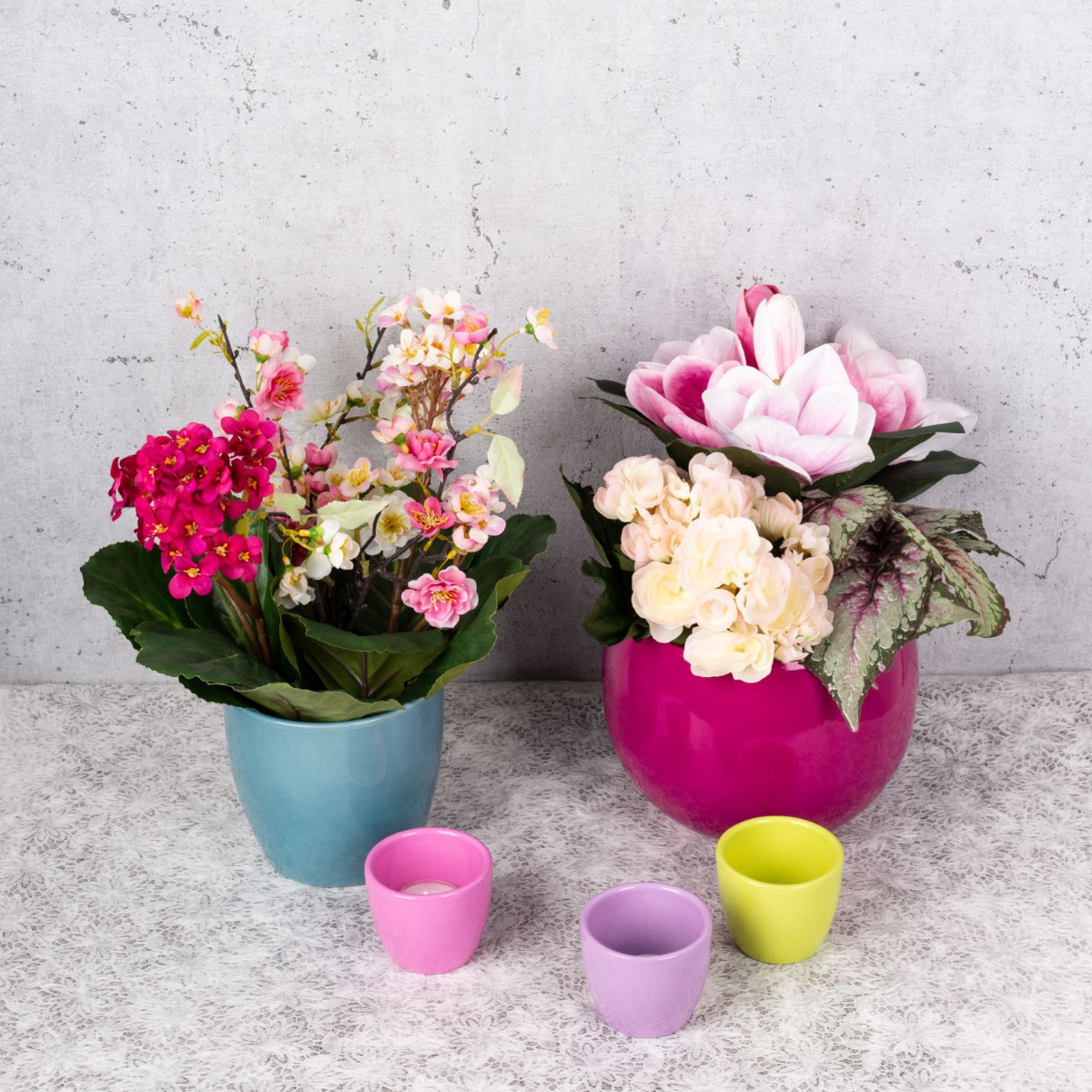 Colorido y alegre en verano! Las pequeñas macetas de la serie Teheran se han convertido en portacandelitas e iluminan el diseño monocromático de las flores de principios de verano. El esplendor que la naturaleza saca a la luz es aquí especialmente visible. Magnolias, begonias, bergenias y cerezos en flor se han unido en este look para crear un arreglo veraniego. Un clásico para todos los hogares. ¡Compra el look!