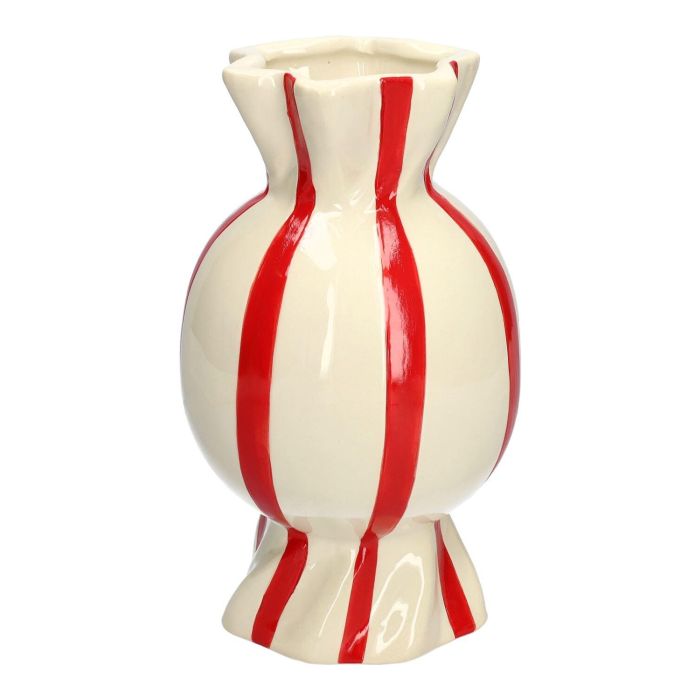 Jarrón achatado con tallo para flores Bonbon AMIEL de cerámica, con rayas longitudinales, rojo y blanco, 24,7 cm, Ø 14 cm