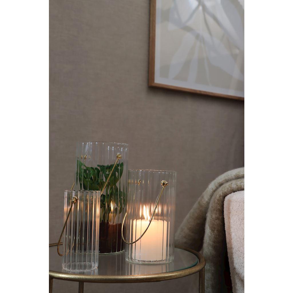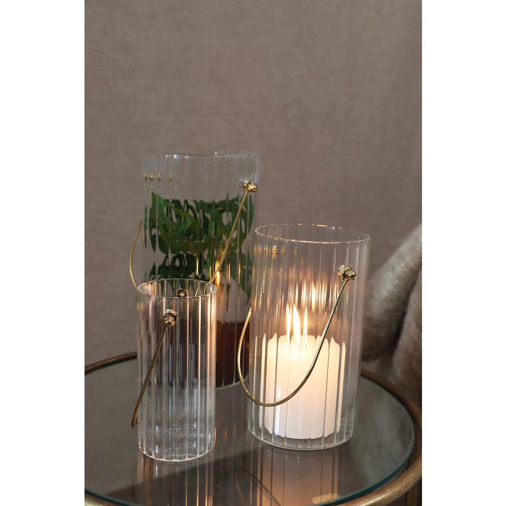 Jarrón decorativo BLANDINA con asa, vidrio, estriado, transparente-dorado, 18 cm, Ø 10 cm
