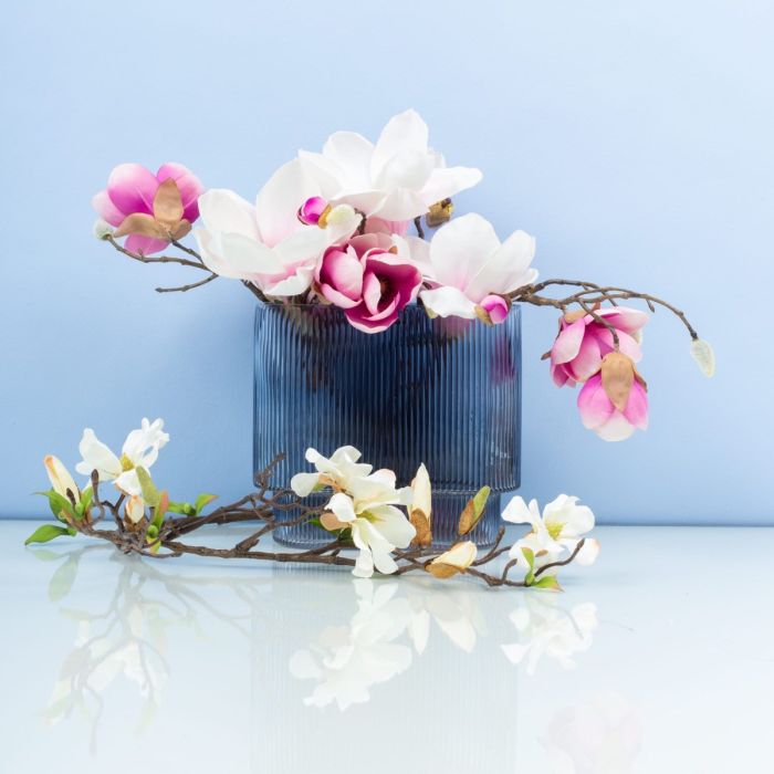 ¡Azul como el cielo! Las magnolias deleitan los corazones de muchos a principios de verano y lucen impresionantes y elegantes gracias a sus grandes flores. Esta flor también merece una gran admiración, teniendo en cuenta que ya floreció en el período Cretácico. A lo que los dinosaurios probablemente apreciaban menos, nosotros le rendimos un homenaje especial. La belleza de estas flores se destaca especialmente en el jarrón ovalado azul real y no requiere ningún accesorio.¡Compra el look!