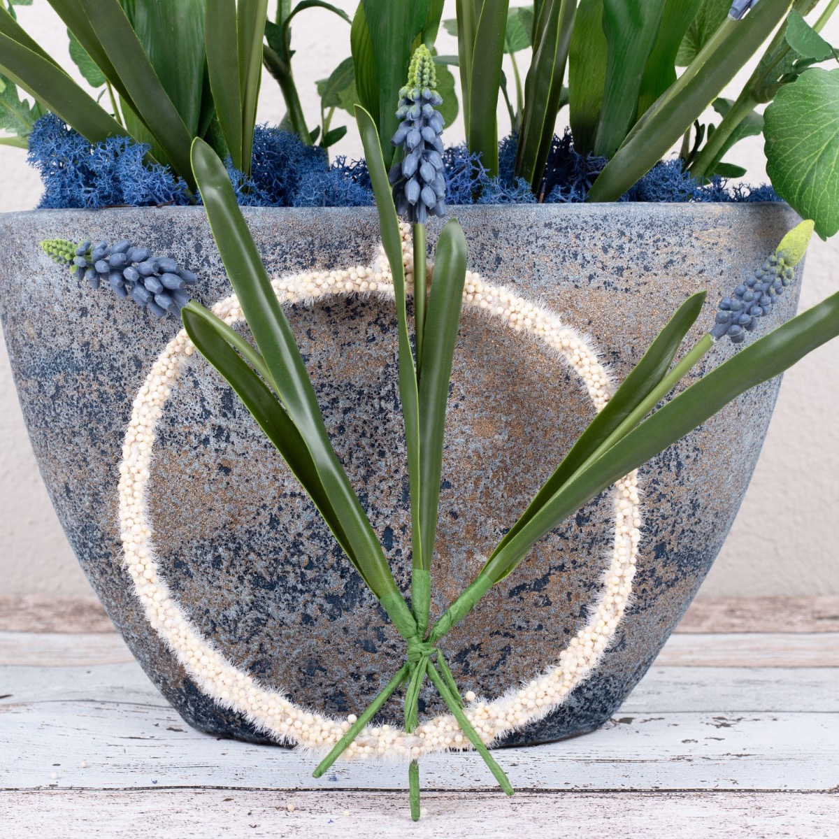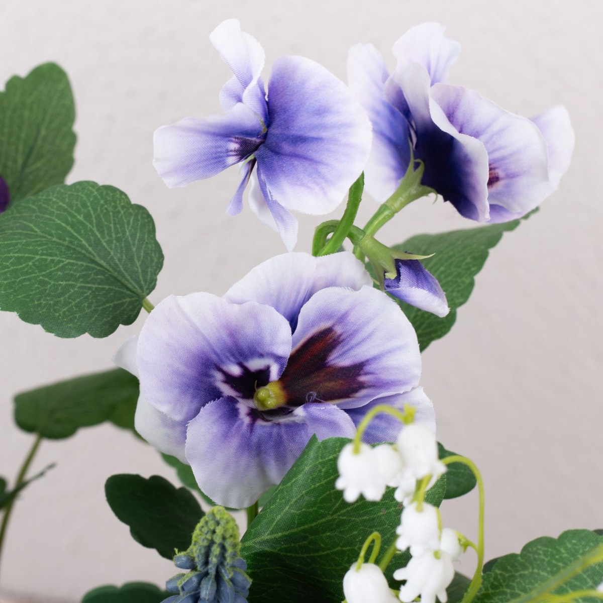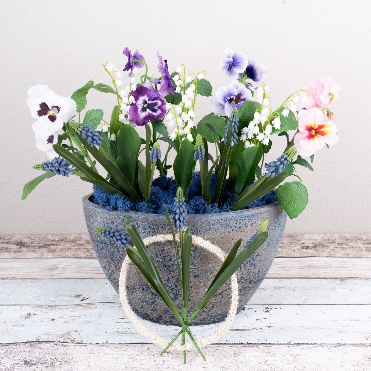 ¡Azul celeste con colores delicados! Las flores tempranas de colores refrescan cualquier lugar. Los jacintos azules brillan entre las campanillas y los pensamientos y realzan el musgo natural de color azul brillante. Un anillo decorativo flocado con un colgante. En este look lo usamos como adorno adicional para el arreglo al colocarle 3 jacintos. ¡Una gran sorpresa de cumpleaños! ¡Compra el look!