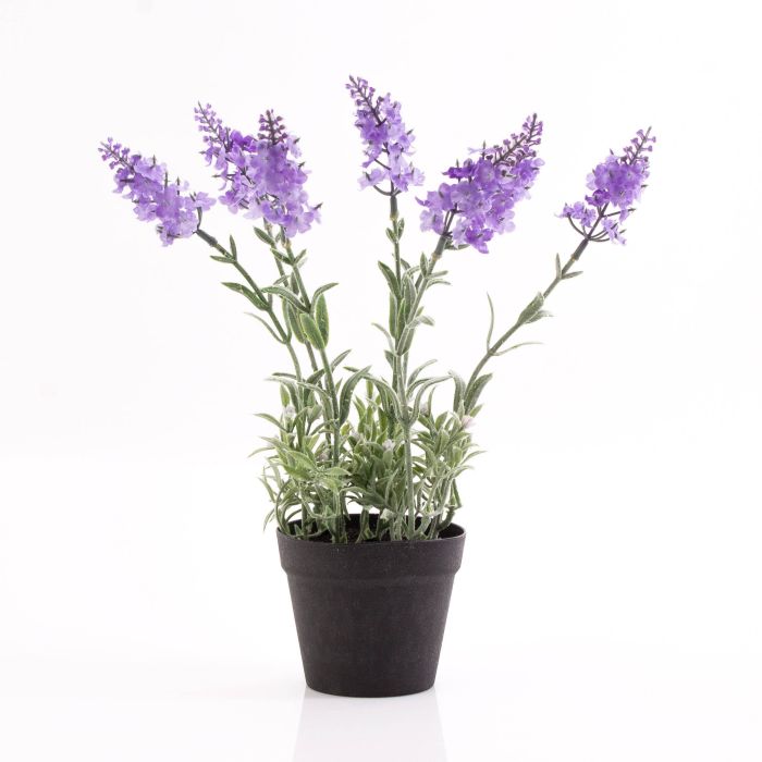 Planta de lavanda artificial en tiesto negro de plástico con tierra negra decorativa. La planta posee junto con su tiesto una altura total aproximada de 29 cm.