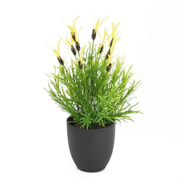 Lavandula Stoechas artificial en tiesto decorativo. La lavanda mide unos 40 cm de alto en total y tiene pétalos de color amarillo.