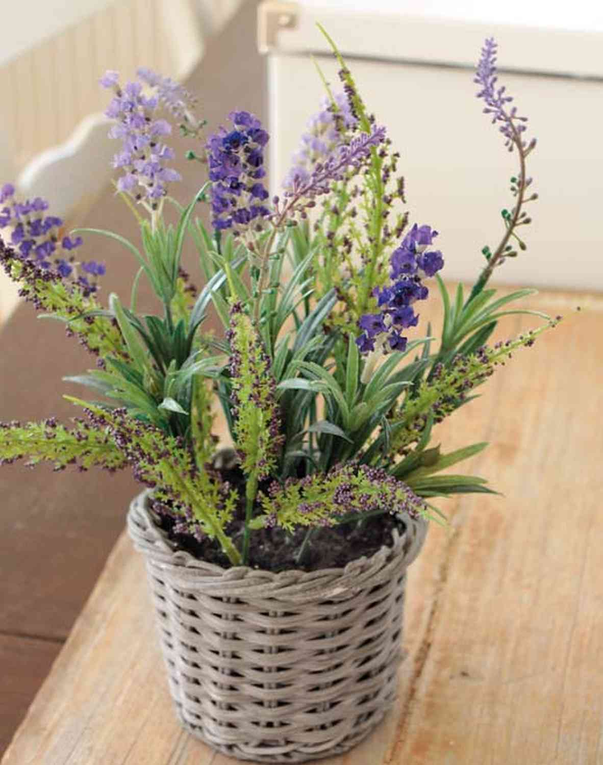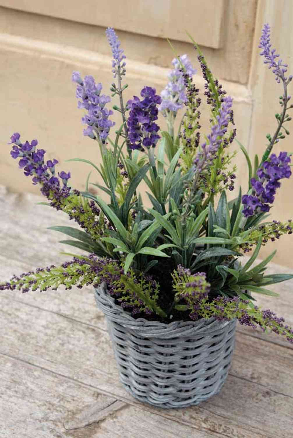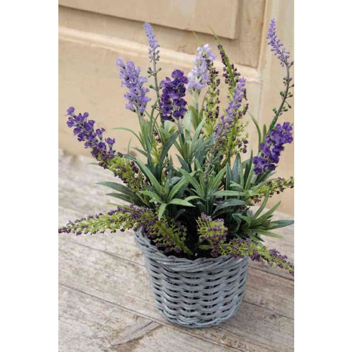 Lavandula angustifolia sintética KIRSA de color violeta tiene un alto total aproximado de 30 cm. La planta artificial crea un ambiente agradable en la habitación y se suministra en una cesta de mimbre.