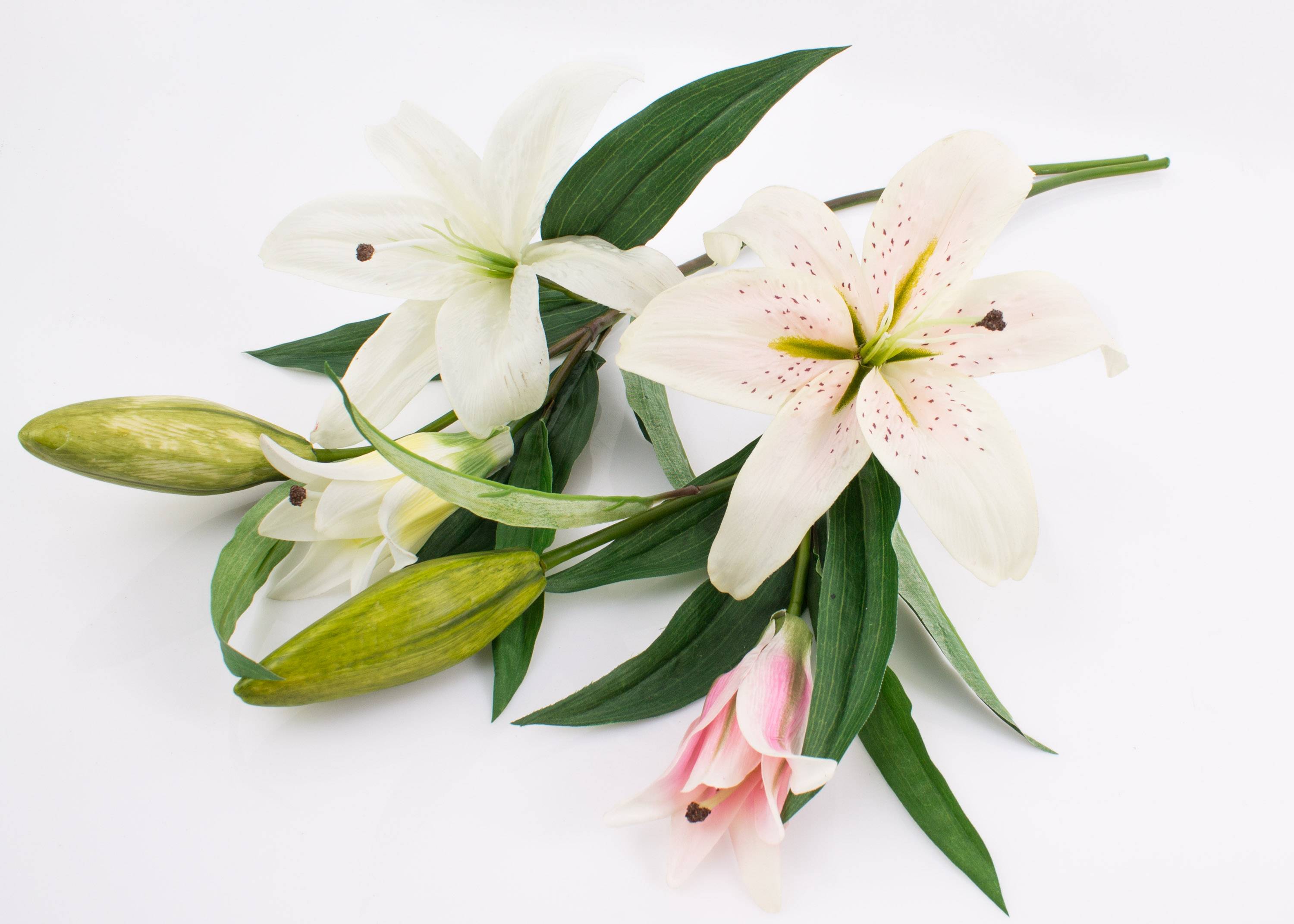 - 1 flor hecha de fibra textil de alta calidad con recubrimiento que le hace parecer real al tacto, puntos rojos oscuros en los pétalos, estigma de aspecto real, 2 brotes florales