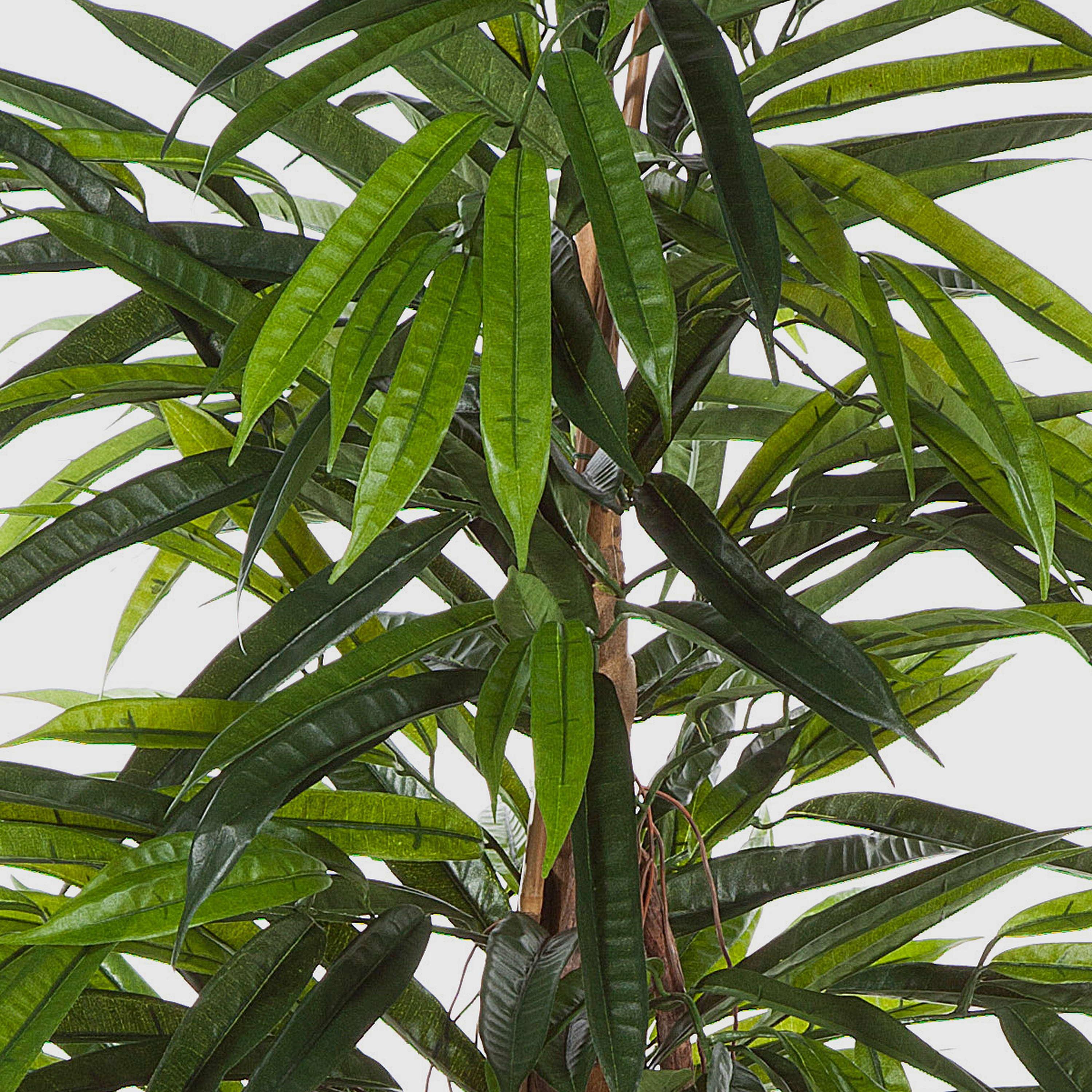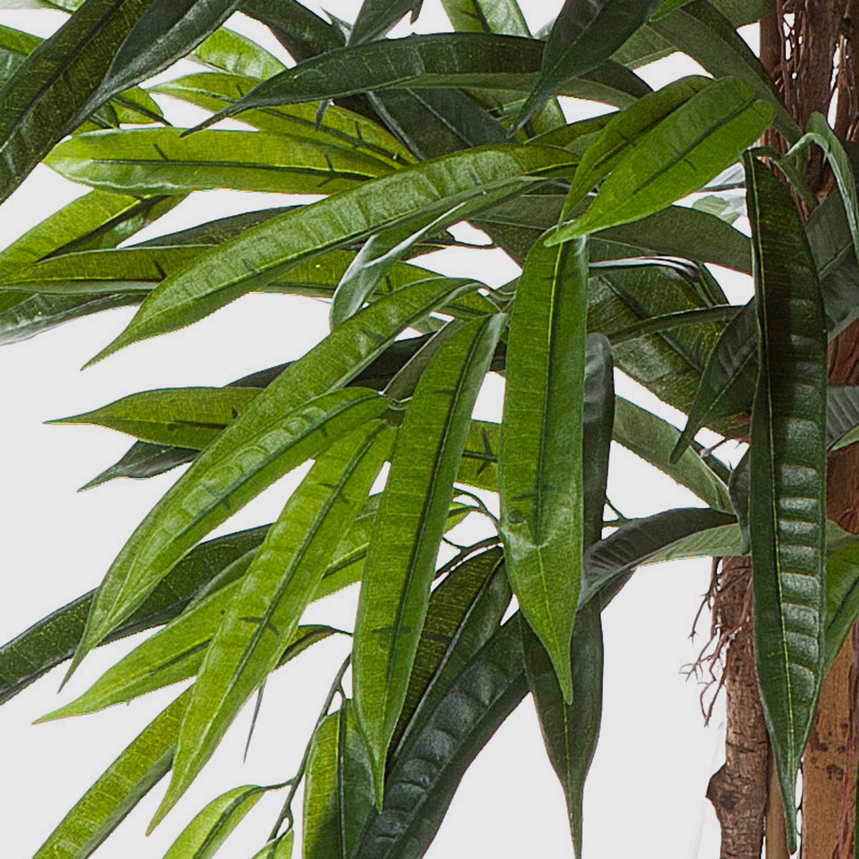 La apariencia natural del árbol artificial AKUMO se logra gracias a sus hojas finamente veteadas en distintos tonos de verde junto con sus troncos de madera real. Además de un tronco grueso, el árbol de aprox. 120 cm de alto posee troncos finos y raíces aéreas.