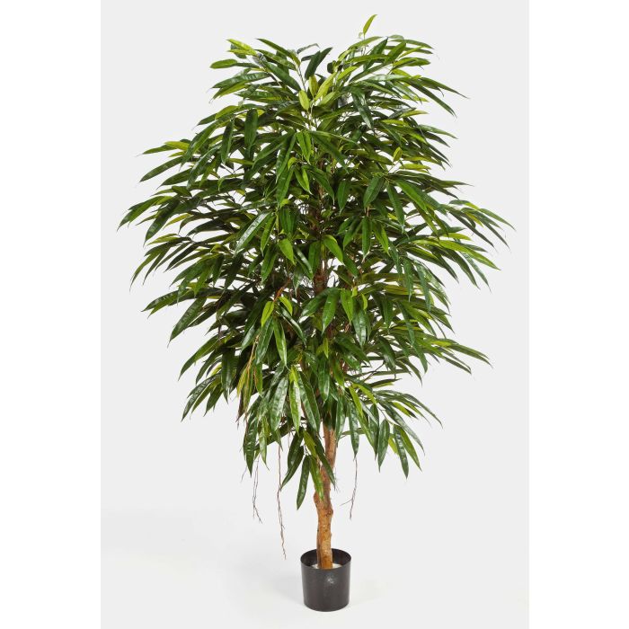 La Longifolia decorativa HISA posee un tronco natural de color marrón con ramas marrones y un denso follaje compuesto por hojas alargadas de color verde. El árbol artificial mide aproximadamente 210 cm de alto y está fijado a un tiesto redondo.