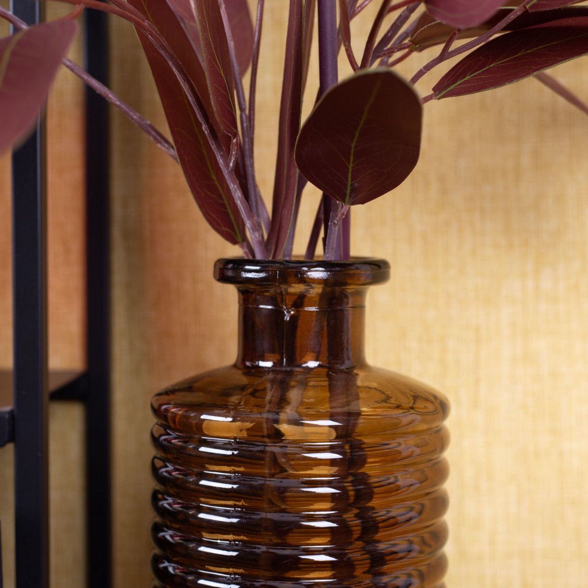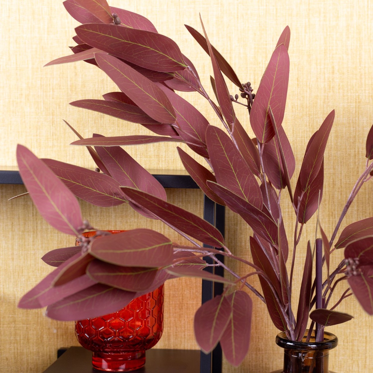 Consejo de diseño: Corta las ramas de eucalipto rojo oscuro al tamaño del jarrón y colócalas en él. Para un arreglo armonioso, hemos convertido el jarrón cilíndrico marrón en un pedestal. El ramo DIY ya está cortado a medida y puede colocarse directamente en el jarrón. El ramito de bayas se cuelga en el borde del jarrón cilíndrico más pequeño. Si quieres, puedes rellenar el jarrón con gránulos de corcho para que no se vea el tallo. Este look es muy fácil de recrear.