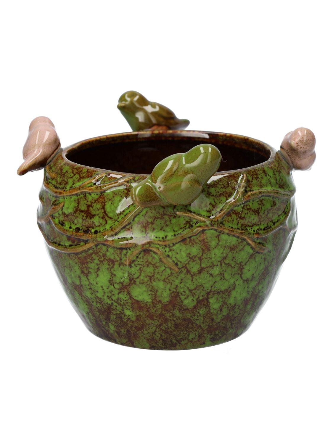 Maceta redonda SARINO de cerámica, con pájaros en 3D, verde-marrón-beige, 10,5 cm, Ø 14 cm