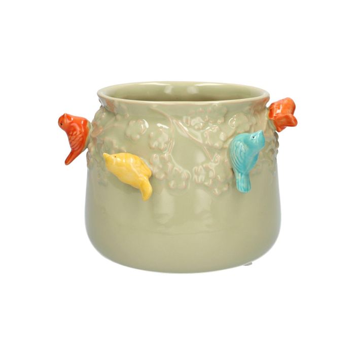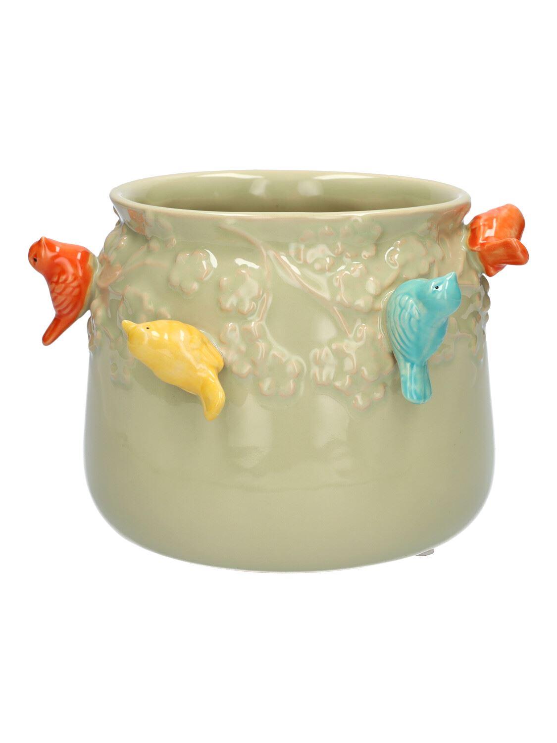 Macetero BIRDIE de cerámica, con pájaros en 3D, verde-naranja-amarillo-azul, 11 cm, Ø 13,5 cm