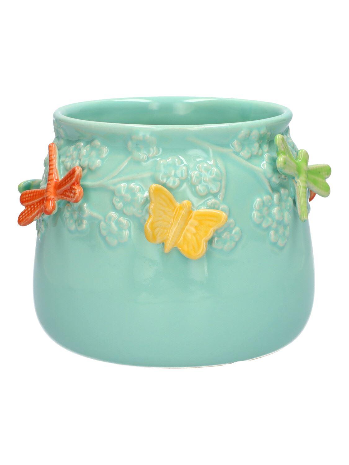 Macetero KIMANA de cerámica, mariposas y libélulas en 3D, azul, naranja, amarillo y verde, 11 cm, Ø 13,5 cm