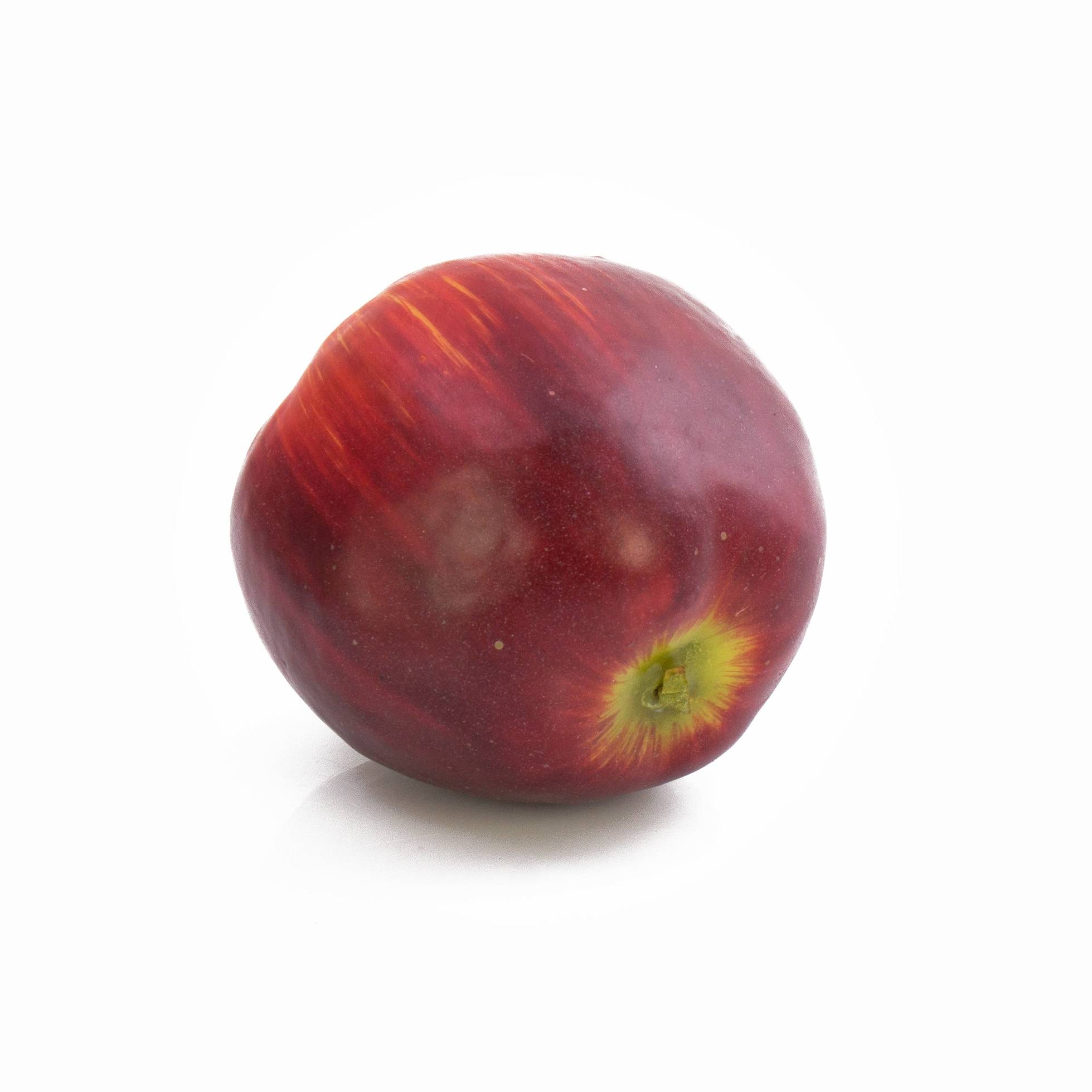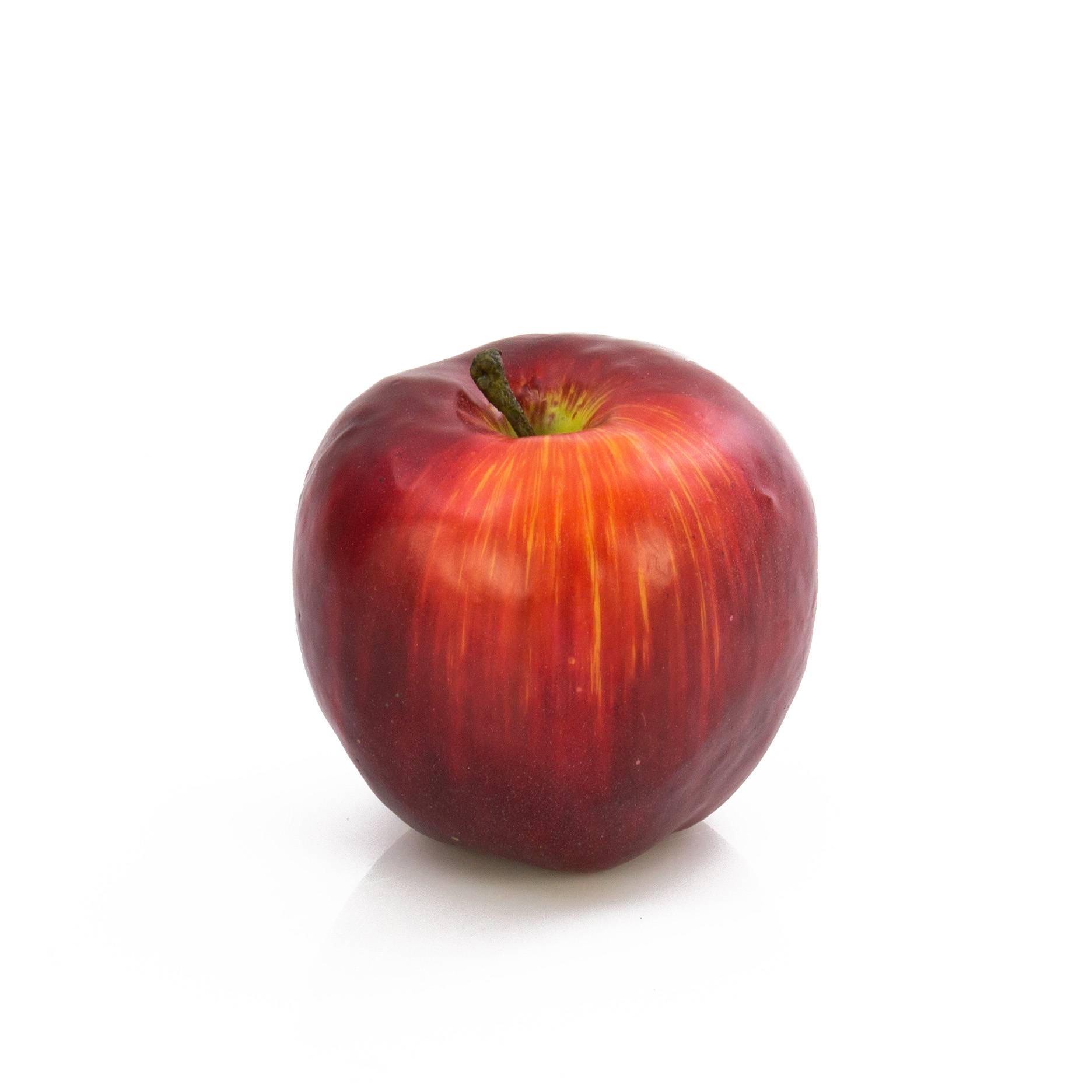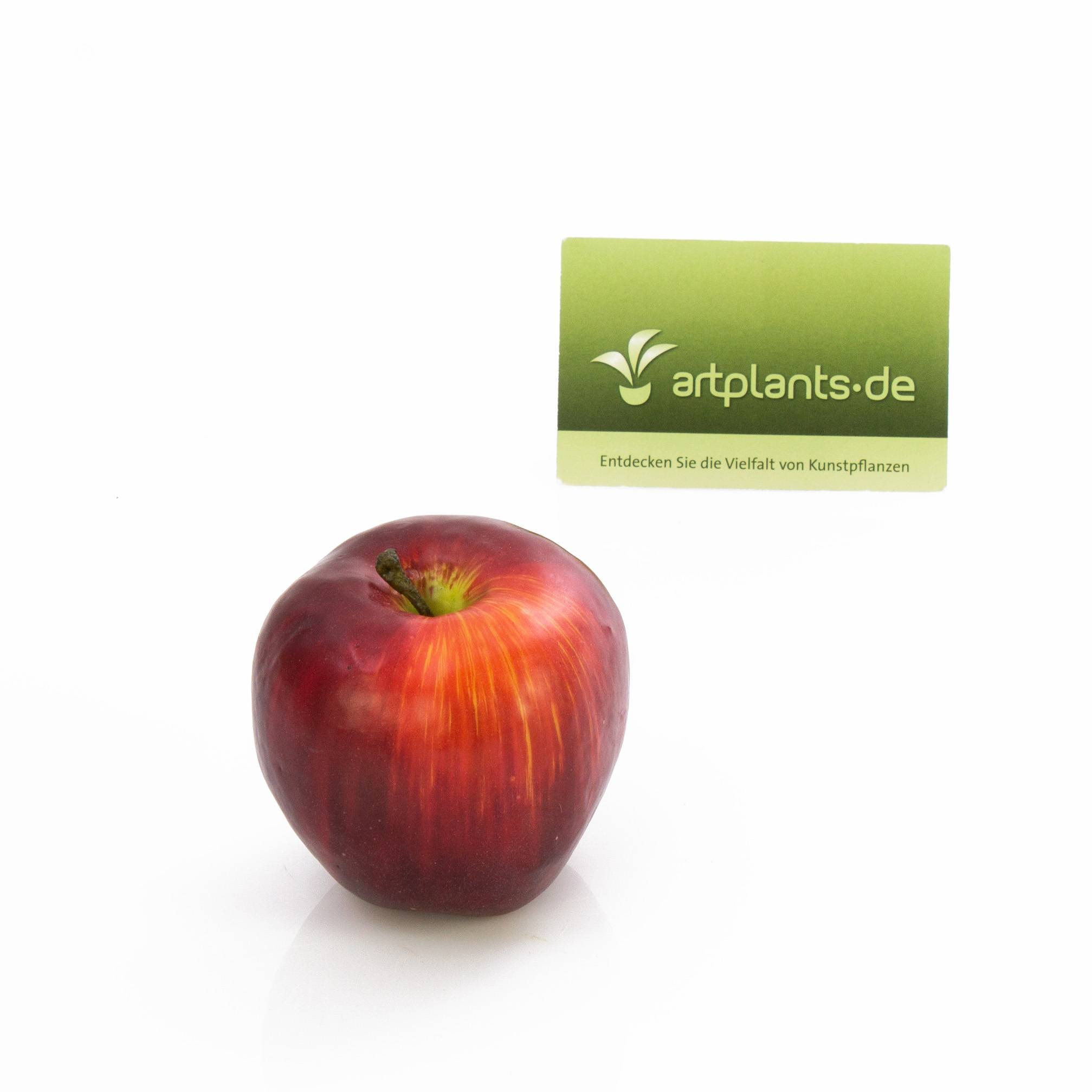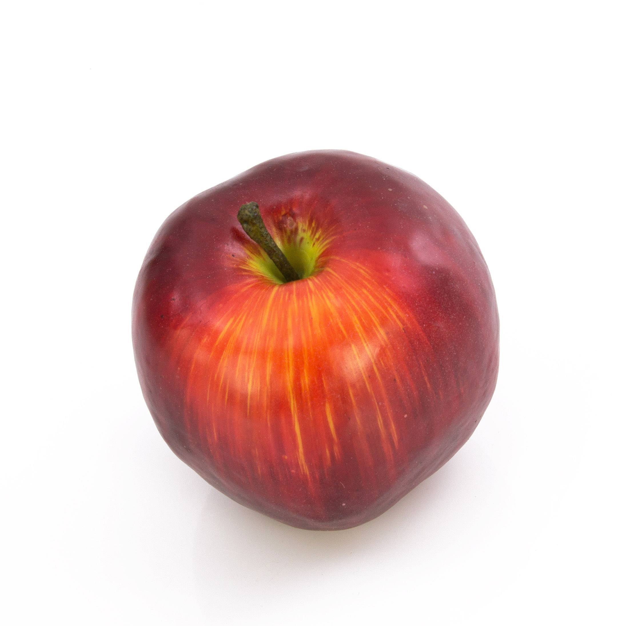 Manzana artificial en color rojo oscuro con un diámetro aproximado de 6,5 cm.